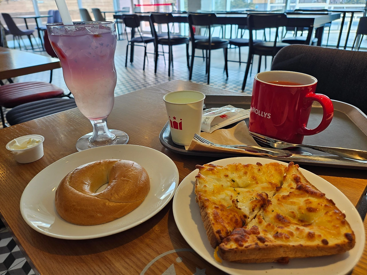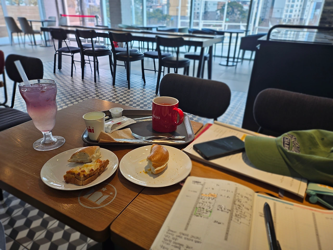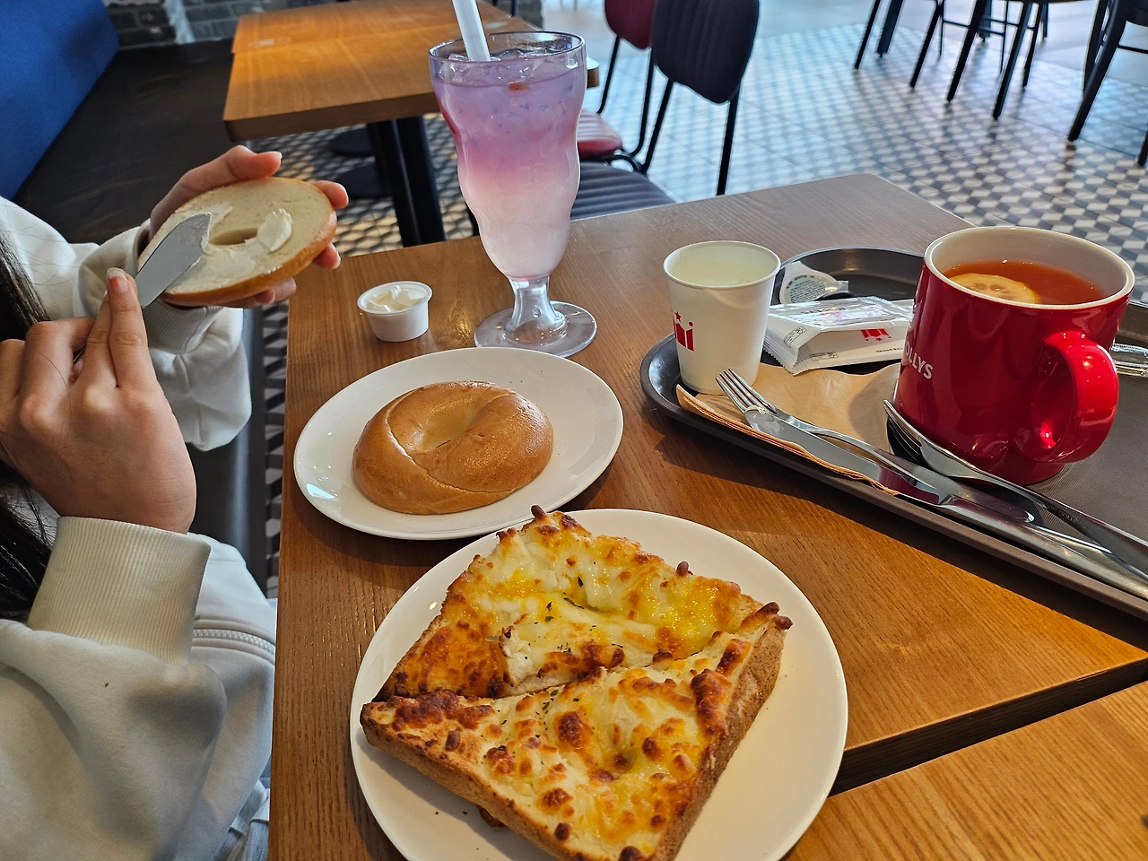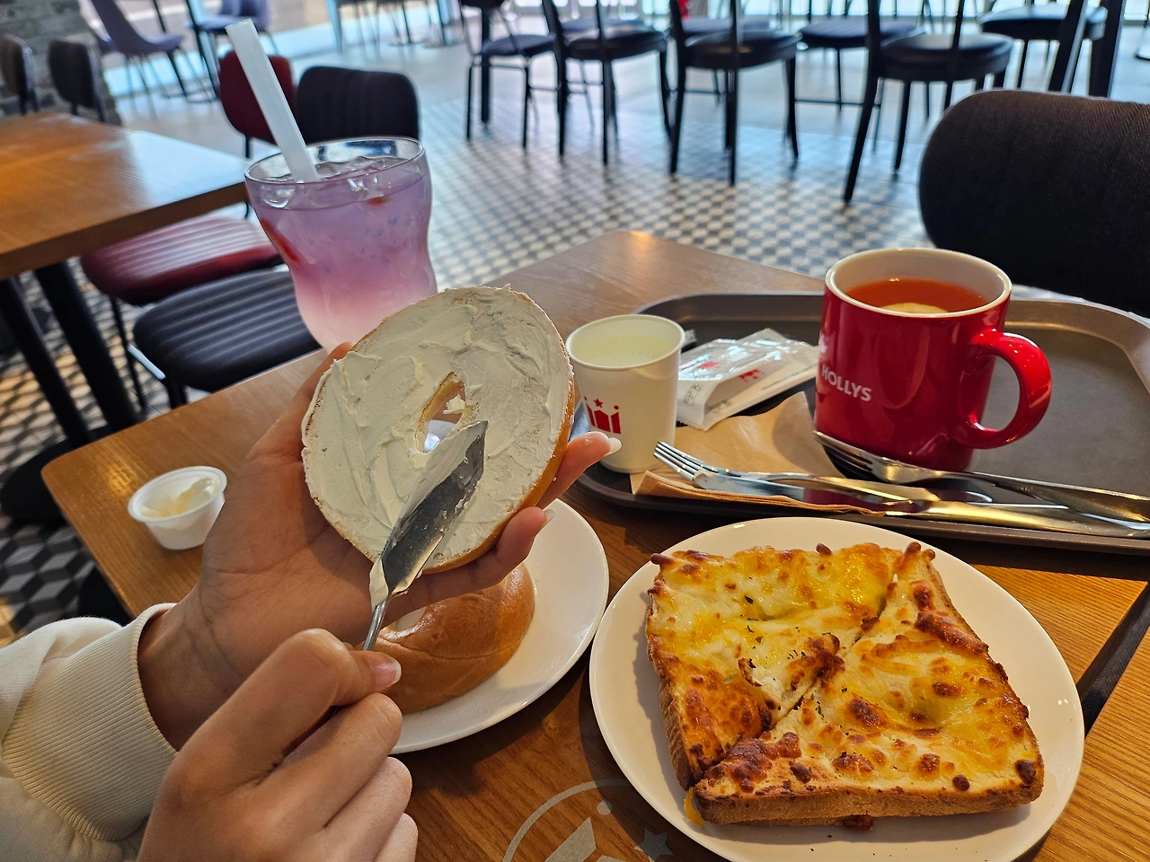 2층은 공부하는 부류, 도란도란 이야기 나누는 팀으로 나누어 아늑하고 아주 맘에 들었다. 처음부터 2층, 내가 픽한 자리에 앉고 싶었지만 부득부득 3층으로 가겠다는 체리의 의견을 들어주는 친절한 엄마가 되어주었다. '그래 한번 갔다 왔으니 니 맘도 내맘도 완벽하다~' 구석에 마주 앉아 둘은 그저 기분이 좋아 미소를 지으며 행복한 생각에 빠져든다. 그냥 이 순간, 이 자체로 너무 평온하고 좋다. 이 때 말라깽이, 소식자 체리에게 간절함이 몰려온다. "엄마! 나 크로크무슈 또 먹고 싶엉~" "또오???" "그리고 밀크티도" "음..." "그래 가자!"집밥으로 아꼈으니 오늘은 기분좋게 맛있게 먹고 분위기를 느껴보자~ 크로크무슈와 밀크티, 그것도 젤 큰사이즈와 아메리카노 한잔을 시켜 갖고돌아온다.