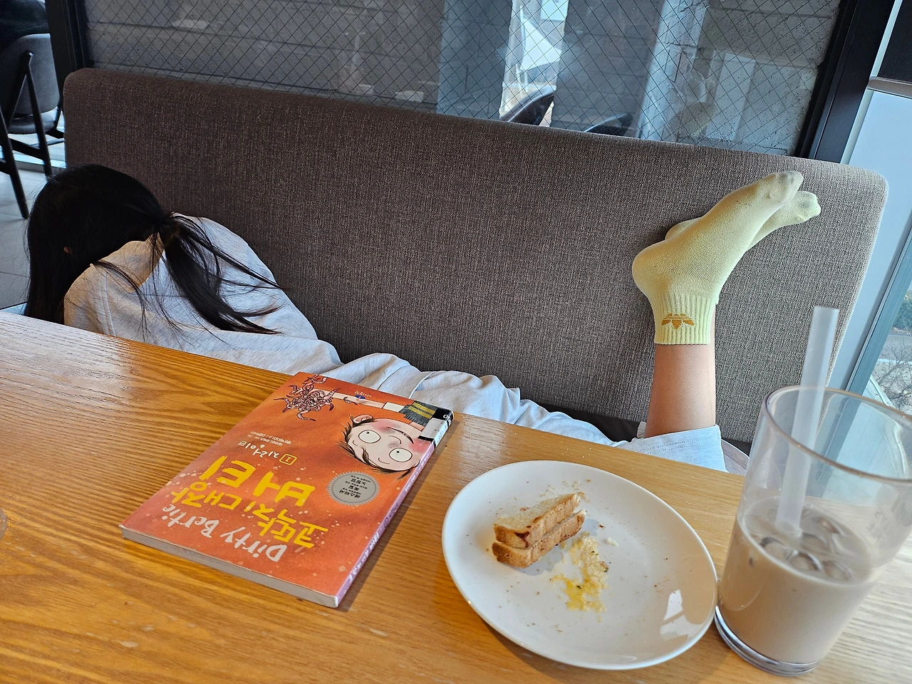 '근데 왜 너넨 책만 읽으면 까페건 어디건 들어눕는거니? 엄마가 민망해진다. 다리라도 내려~' '오늘도 민페사건2를 찍었구나!' 유아도 아니고 다 커서 그러면 엄마가 예의없고 무식한 사람이 된단 말이지...