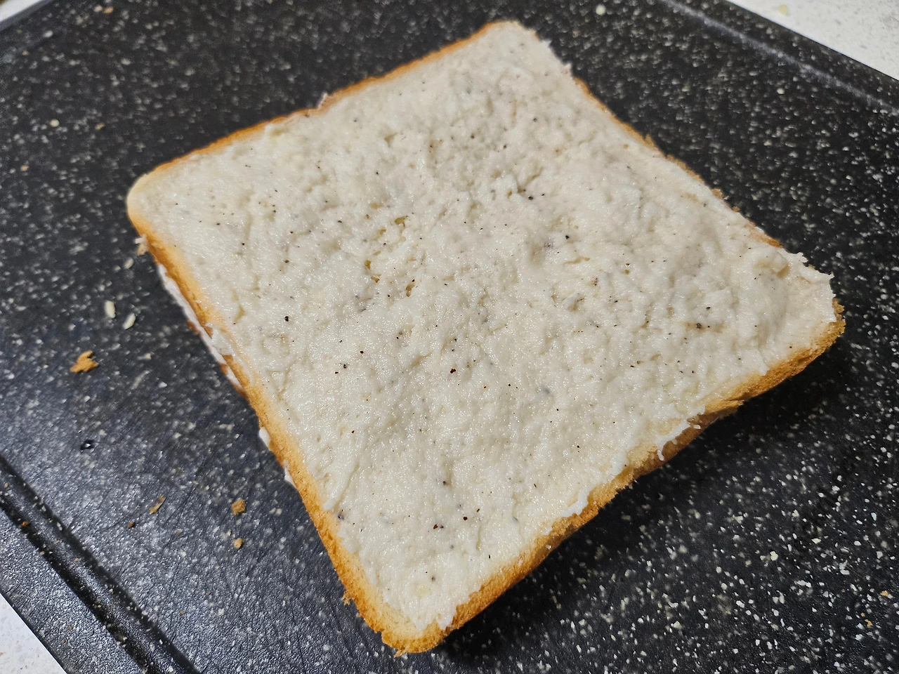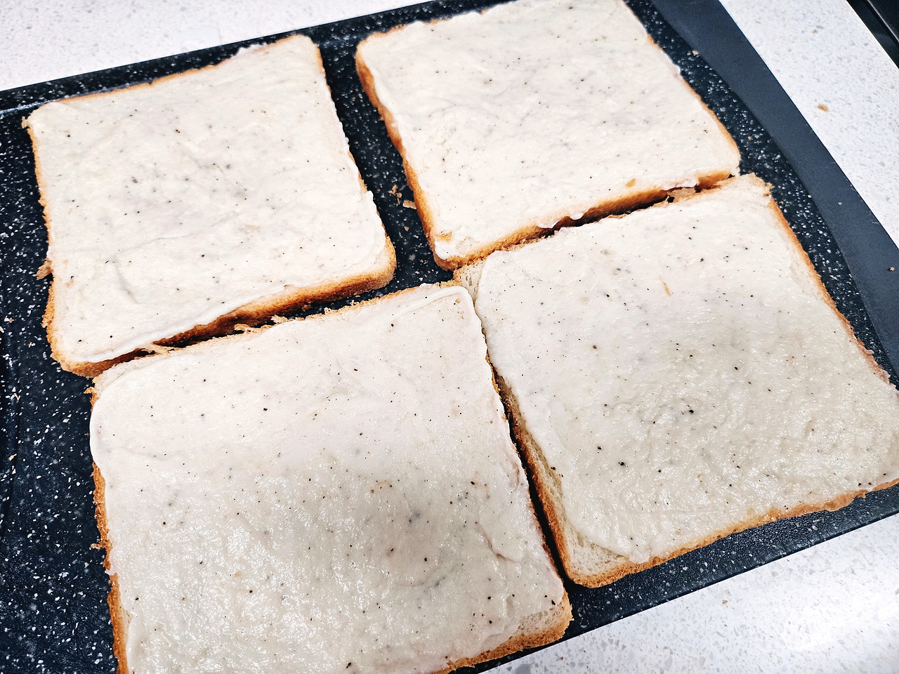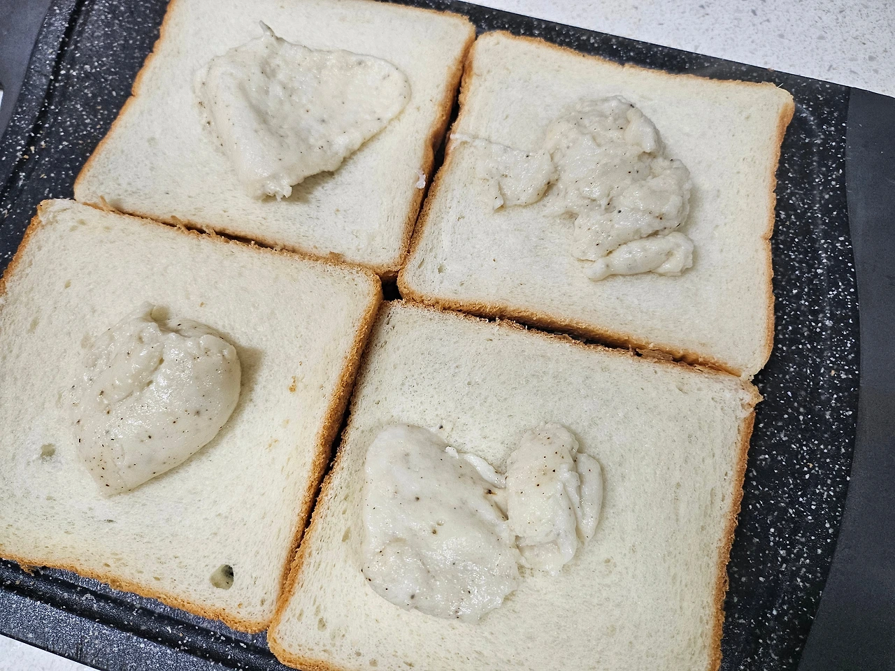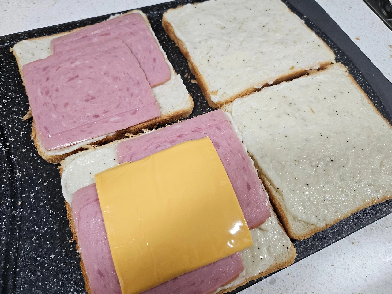 소금, 후추로 간을 하고 빵을 쫘르르 깔아본다. 소스를 분할해서 얹어 놓고, 오케이! 좋았어~~~ 그럼 식빵 모퉁이 구석도 놓치지 않고 꼼꼼히 발라준다. '외면당하는 식빵 모퉁이 난 너마저도 사랑하겠으~' 햄, 체다치즈를 올리고 소스 바른 식빵 올리고, 또 소스 바르고 모차렐라 수북이 올리면 '퍼펙트! 바로 그거야~~~~'