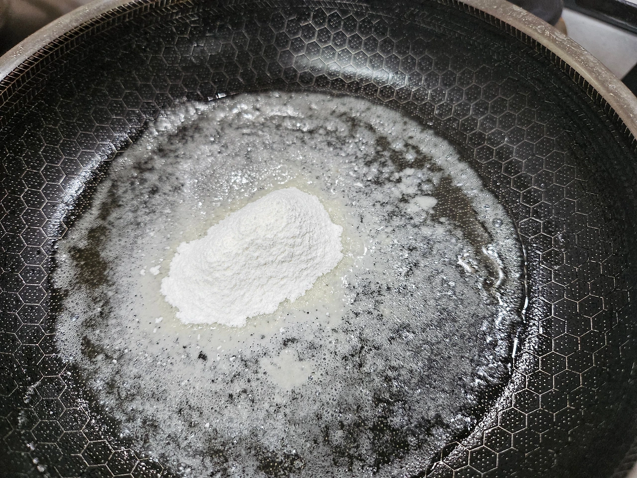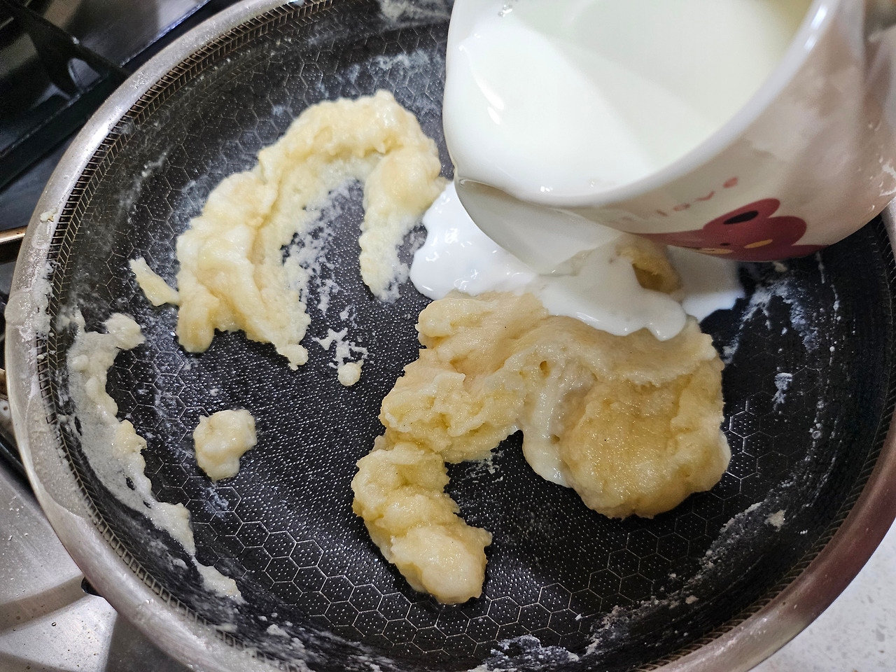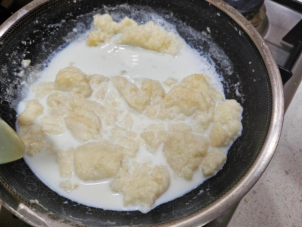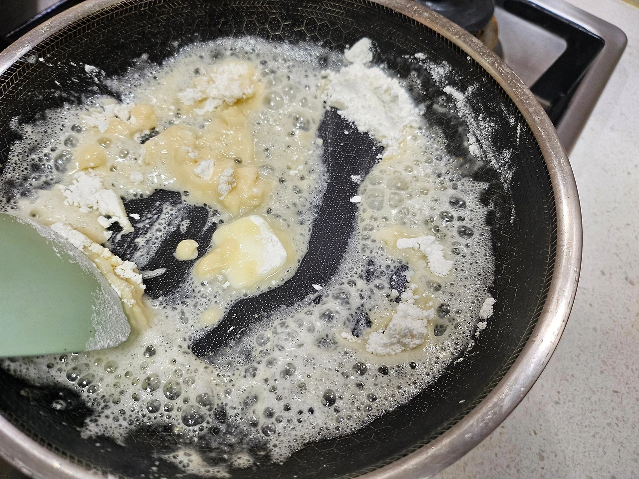 버터 2 숟갈, 난 잘라놓은 버터 2조각을 약불에 녹이고, 밀가루 2 숟갈을 넣어 고르게 섞는다. 너무 적은데 버터랑 밀가루를 더 넣을까 하는 고민이 생긴다. 그러다 급하게 버터 1조각, 밀가루 1 숟갈씩 추가해 본다. 우유 한 컵을 세 번에 나누어 넣으며 섞어 본다. 쉐끼쉐끼~~~~ 내가 밀가루 루를 만들다니 담엔 돈가스 소스로 도전해 보겠으! 자신감이 붙어 구름 위에 나는듯하다. 아주 신났다~