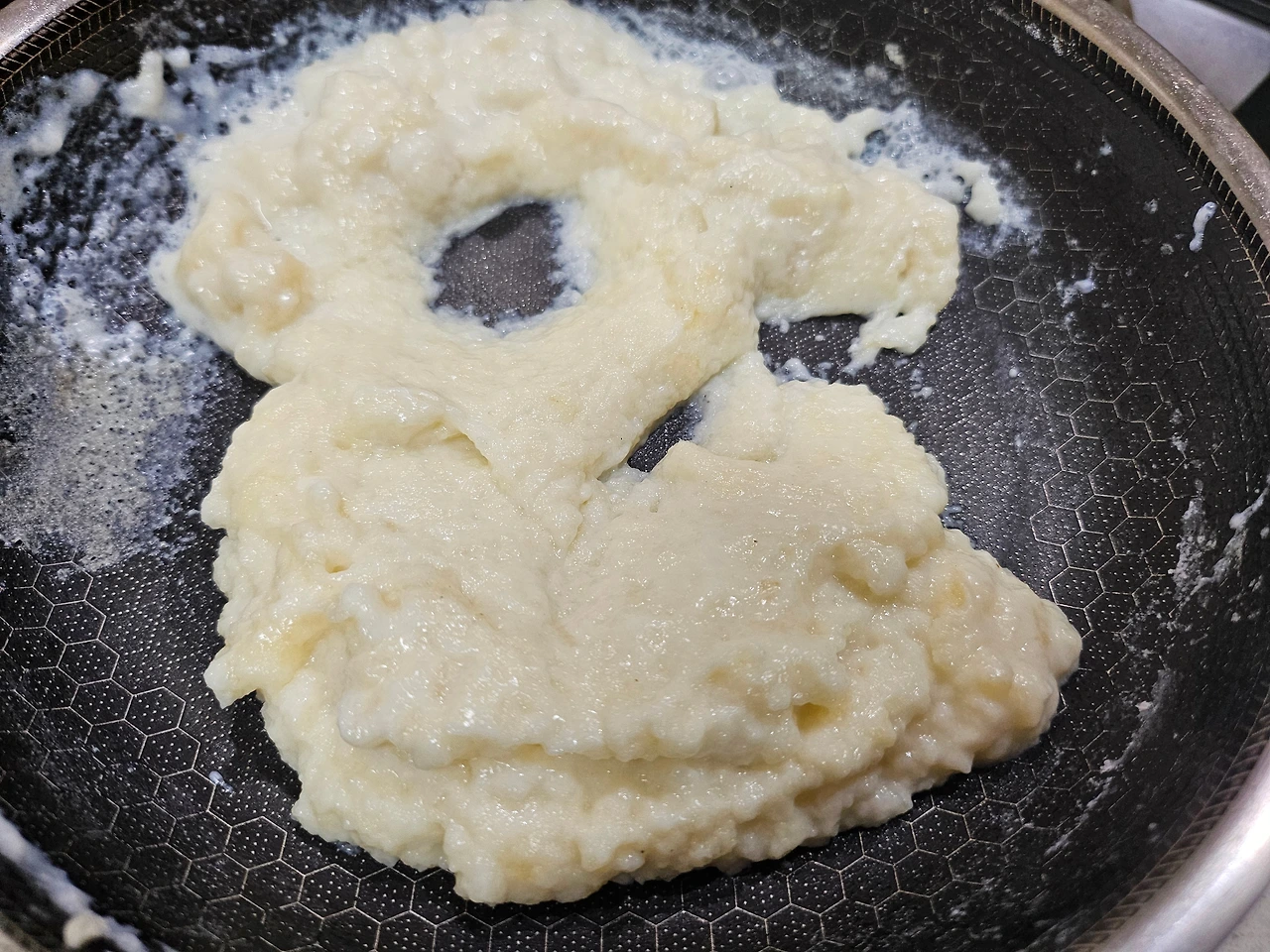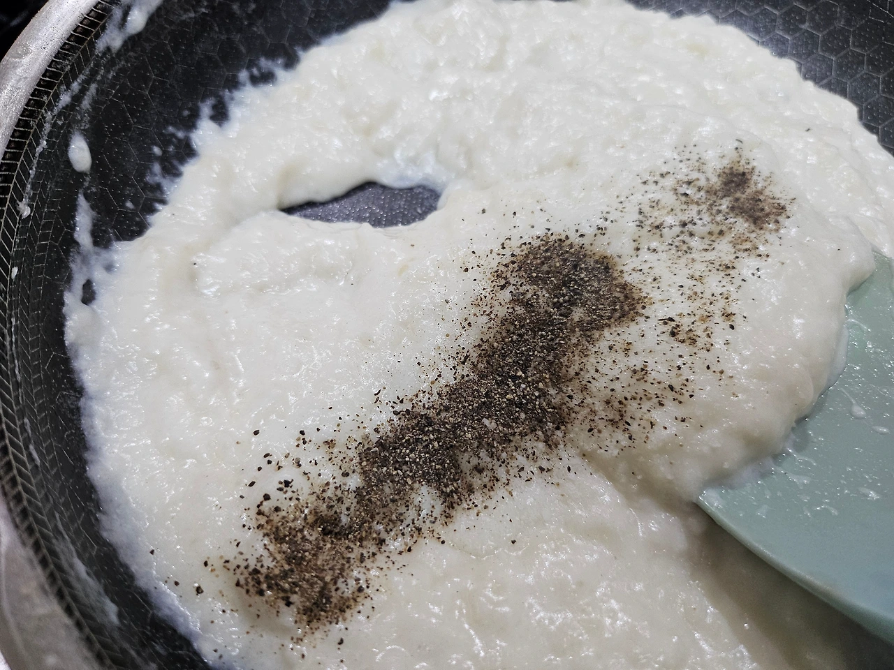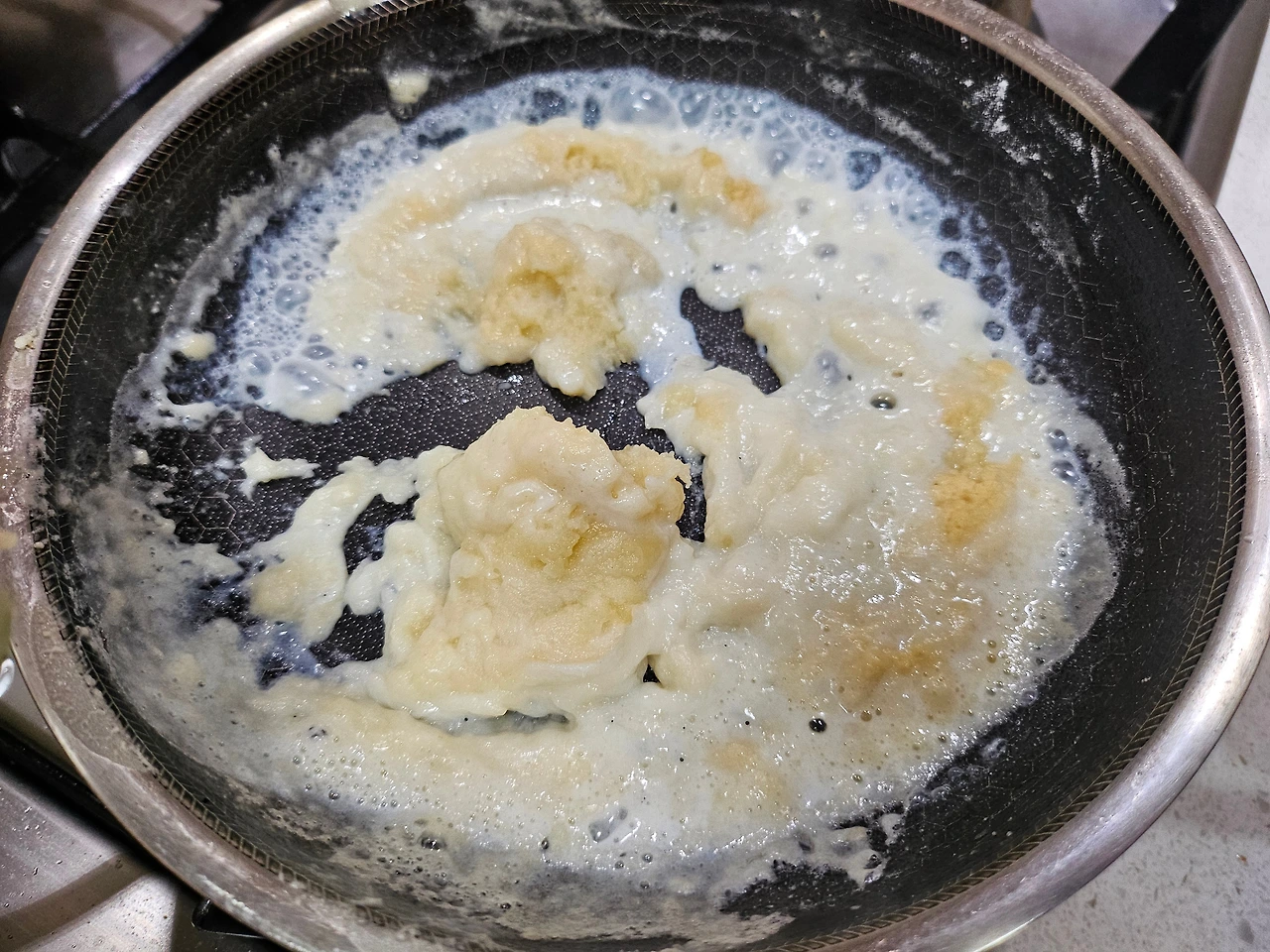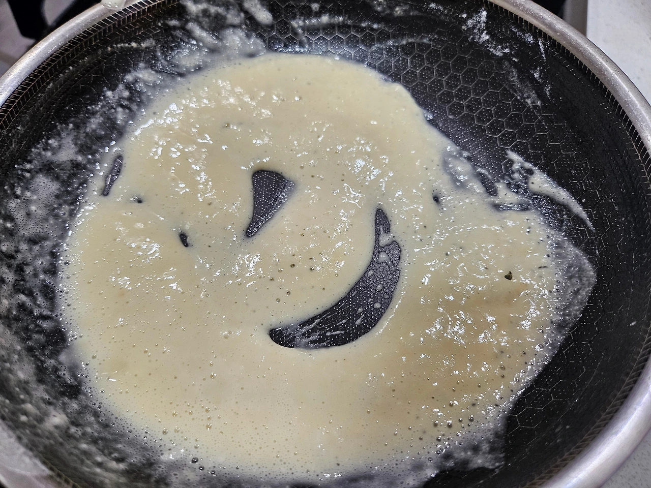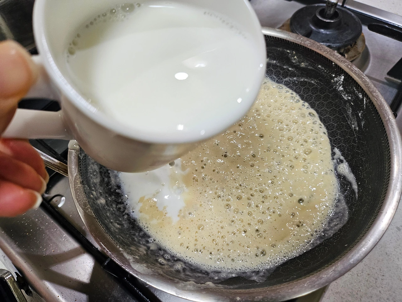 버터 2 숟갈, 난 잘라놓은 버터 2조각을 약불에 녹이고, 밀가루 2 숟갈을 넣어 고르게 섞는다. 너무 적은데 버터랑 밀가루를 더 넣을까 하는 고민이 생긴다. 그러다 급하게 버터 1조각, 밀가루 1 숟갈씩 추가해 본다. 우유 한 컵을 세 번에 나누어 넣으며 섞어 본다. 쉐끼쉐끼~~~~ 내가 밀가루 루를 만들다니 담엔 돈가스 소스로 도전해 보겠으! 자신감이 붙어 구름 위에 나는듯하다. 아주 신났다~