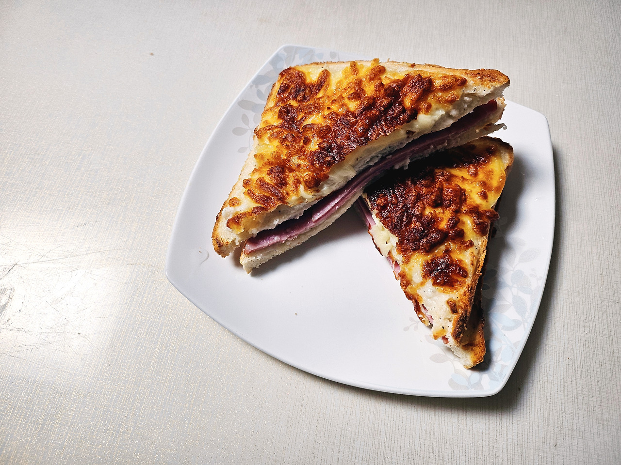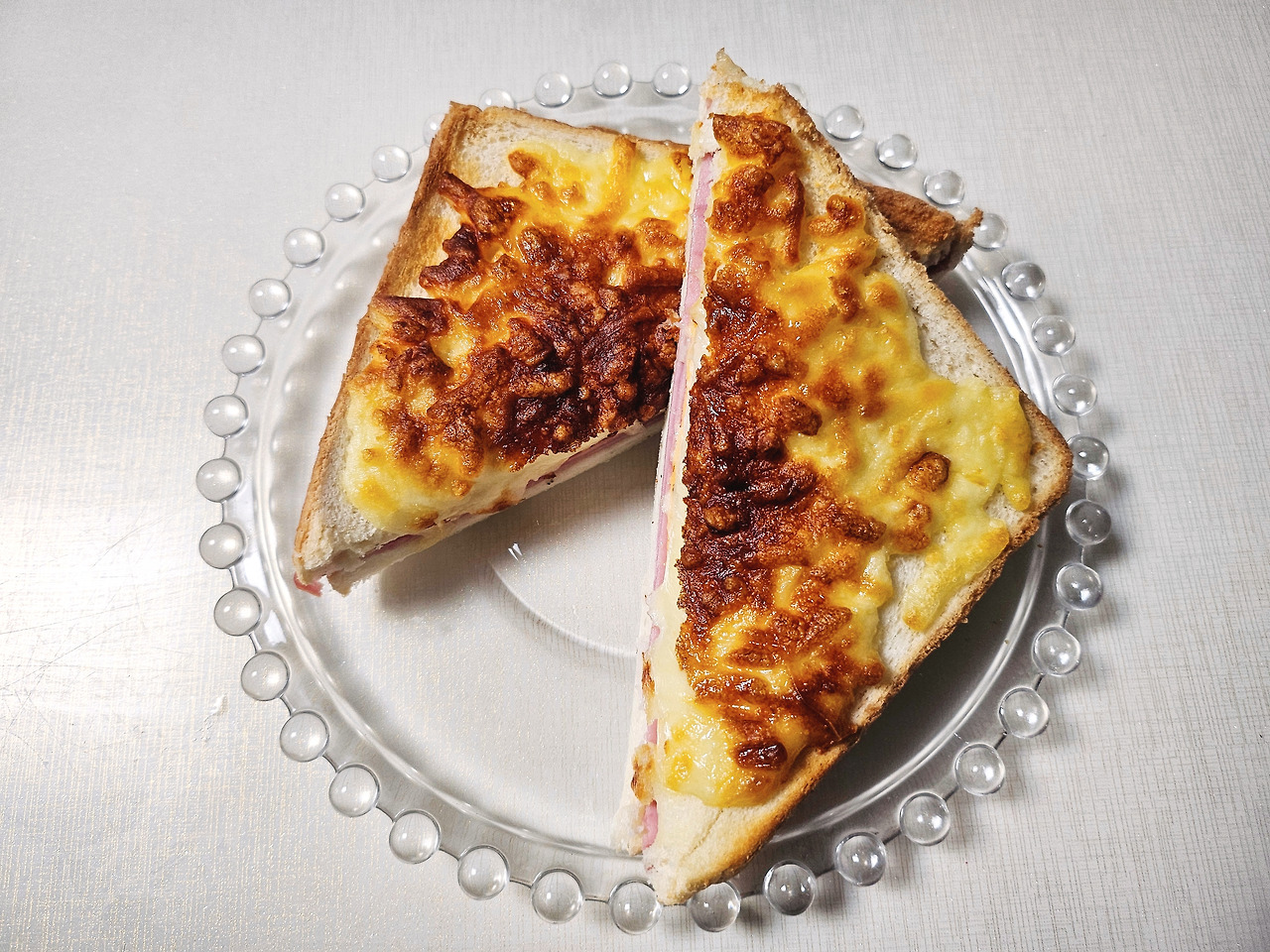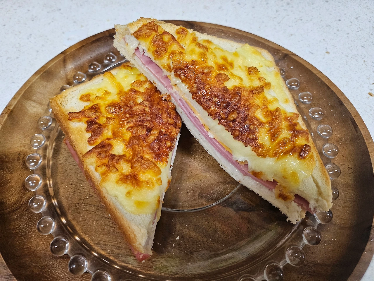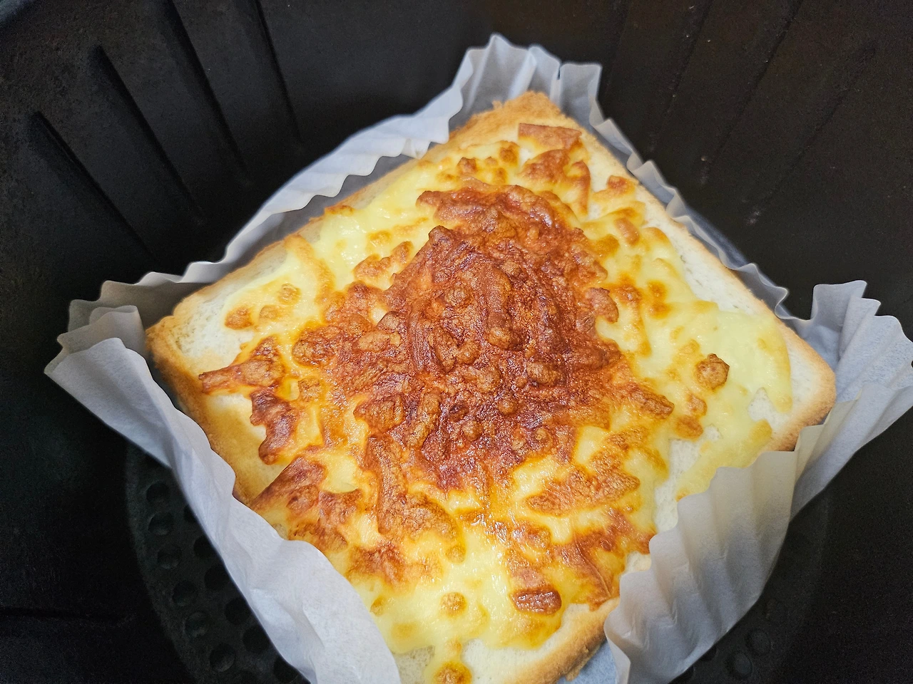 에어후라이기로 들어간다. 맛있게 구워져라~~~~ 5분이 지났나? 한 8분? 맛있는 냄새가 난다. '성공이다! 파슬리따윈 생략이다. 왜냐? 없으니까~~~~~' 그리고 예쁜 척 그릇에 담아낸다. "체리야! 크로크뮤수 먹어~~~~"
