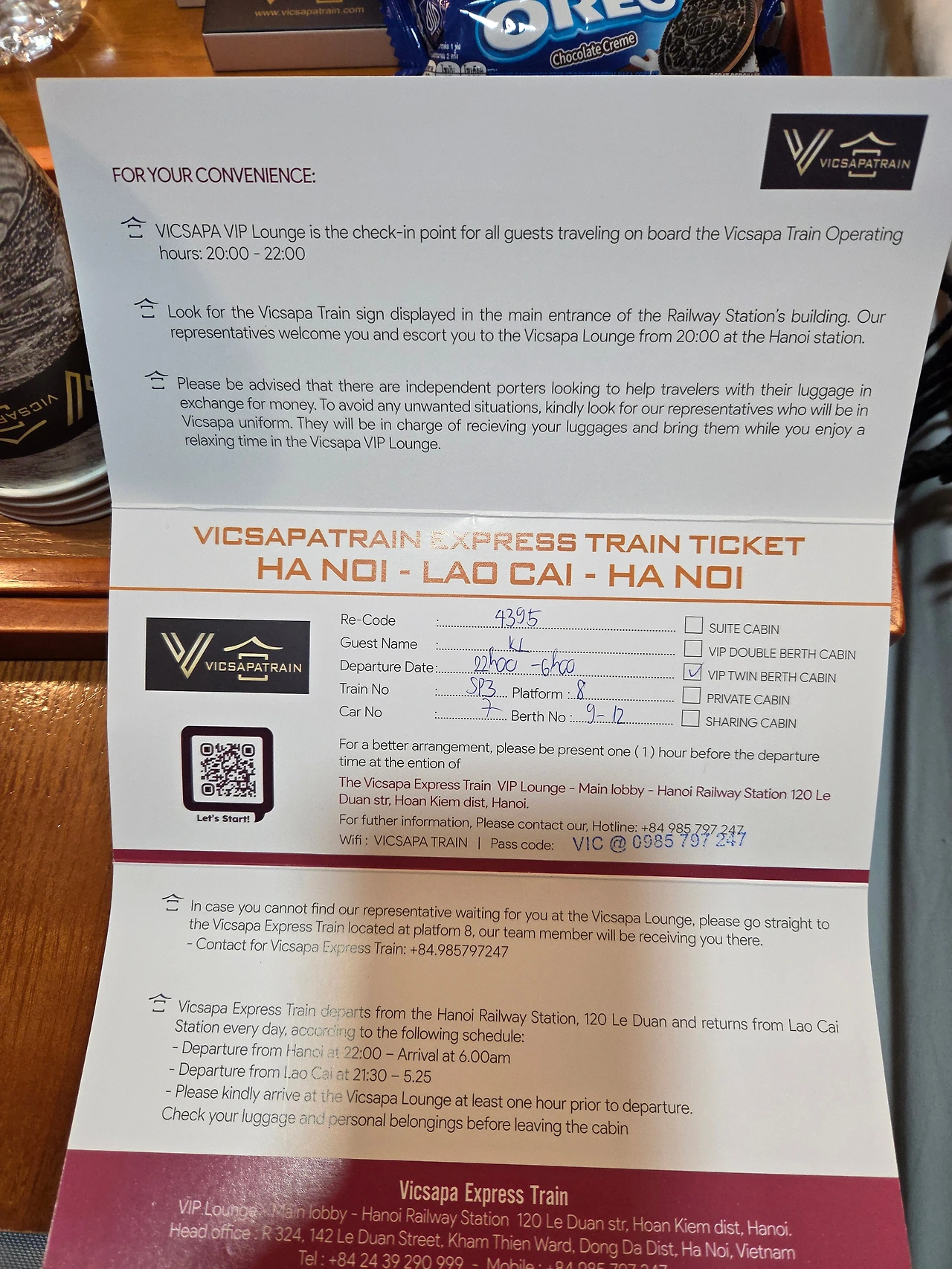 매니저가 예약한 바우처를 확인하고 수기로 기록한 티켓 발권을 해주면 한쪽에서는 예약팀별로 대합실에서 기차에 오르기까지 직접 캐리어도 날라주는 발로 뛰는 서비스를 해주었어요. 알고 보니 사파여행객이 VIP였어요. 국내에서 한 번도 이용한 적 없는 슬리핑 기차를 드디어 탈 수 있게 되었지요.