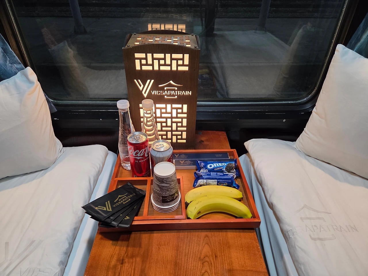 택시도 저렴하게 예약했고 슬리핑 기차는 기대보다 안락해서 우리 둘 다 처음 이용하는 슬리핑 기차를 탔다는 것에 흥분이 되었어요. 운임이 비싼 만큼 실컷 밤기차 낭만을 누리자고 밤 10시가 넘은 시간이었지만 마틸다 하나 씨 작가님께서 전날에 선물로 주신 고오급 수제 건망고와 마트에서 구입해 온 과자도 한 봉지 뜯고 음료를 마시며 야식을 즐겼어요. 비치된 오레오과자는 사파에 가서 고마운 분에게 주려고 챙겼고요.