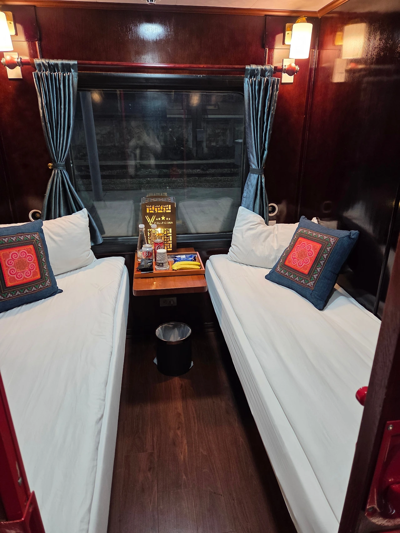 그즈음 베트남이 연일 흐린 날씨가 이어져서 그런지 습기가 많은 상태라 객실 침구류가 한국처럼 뽀송하지는 않았지만 전반적으로 객실은 깨끗이 청소가 된 상태였어요. 객실을 구분하는 벽이 나무판이라서 옆칸 독일인들의 대화가 들렸지만 밤기차의 낭만에 흥분이 되어 몹시 즐거워하는 목소리라서 거슬리지는 않았어요. 개인 조명도 따로 있고 낭만을 즐기기에 나름 아늑했어요. 큰 가방을 침대 밑에 수납하고 작은 가방을 열어 편한 옷으로 갈아입으려니 노크소리가 들렸어요.