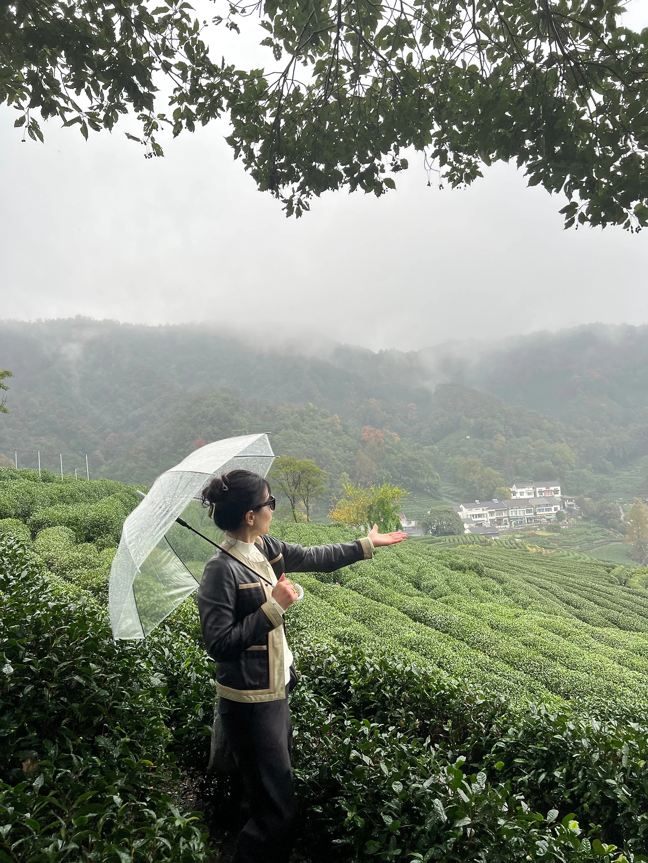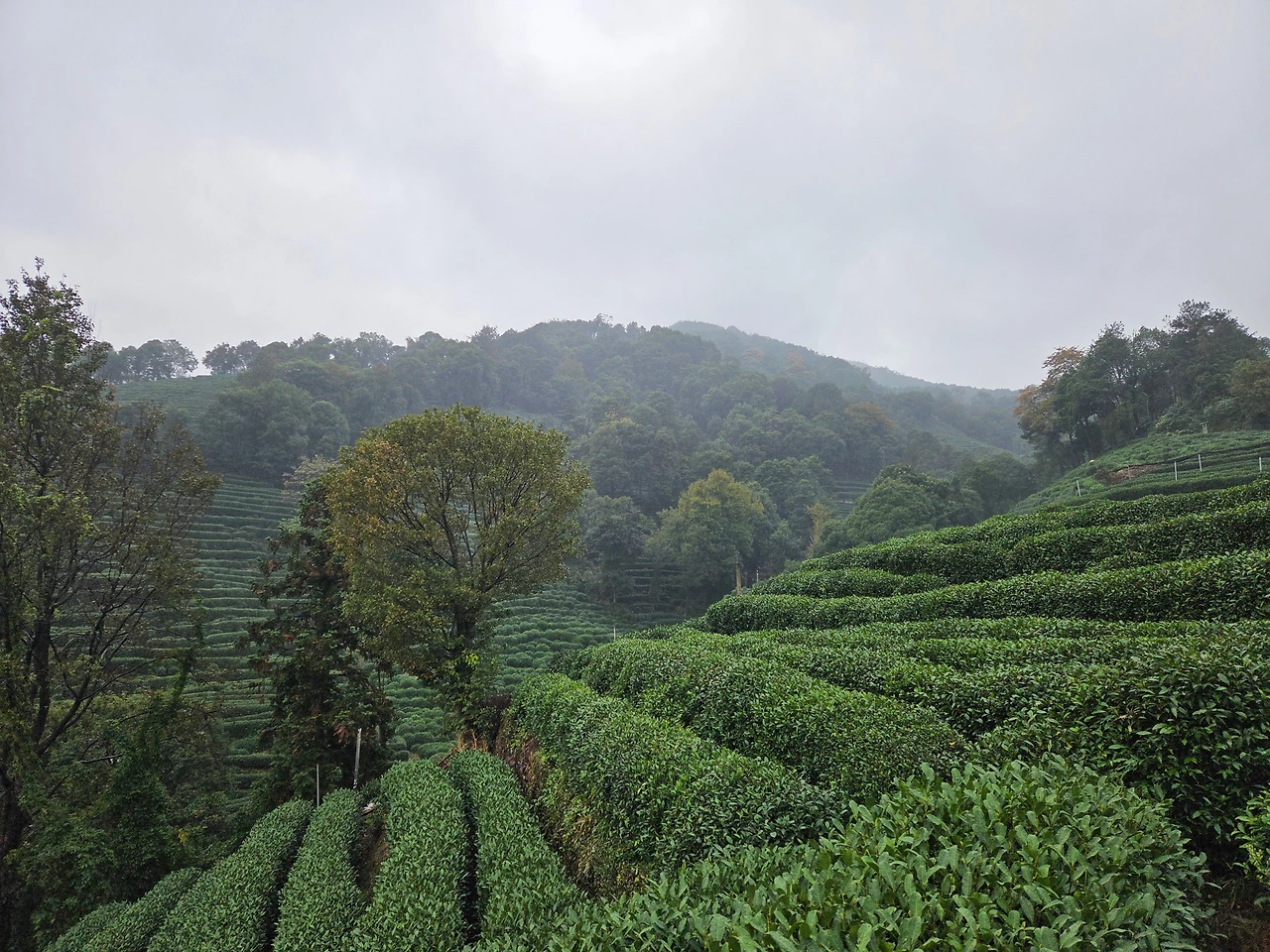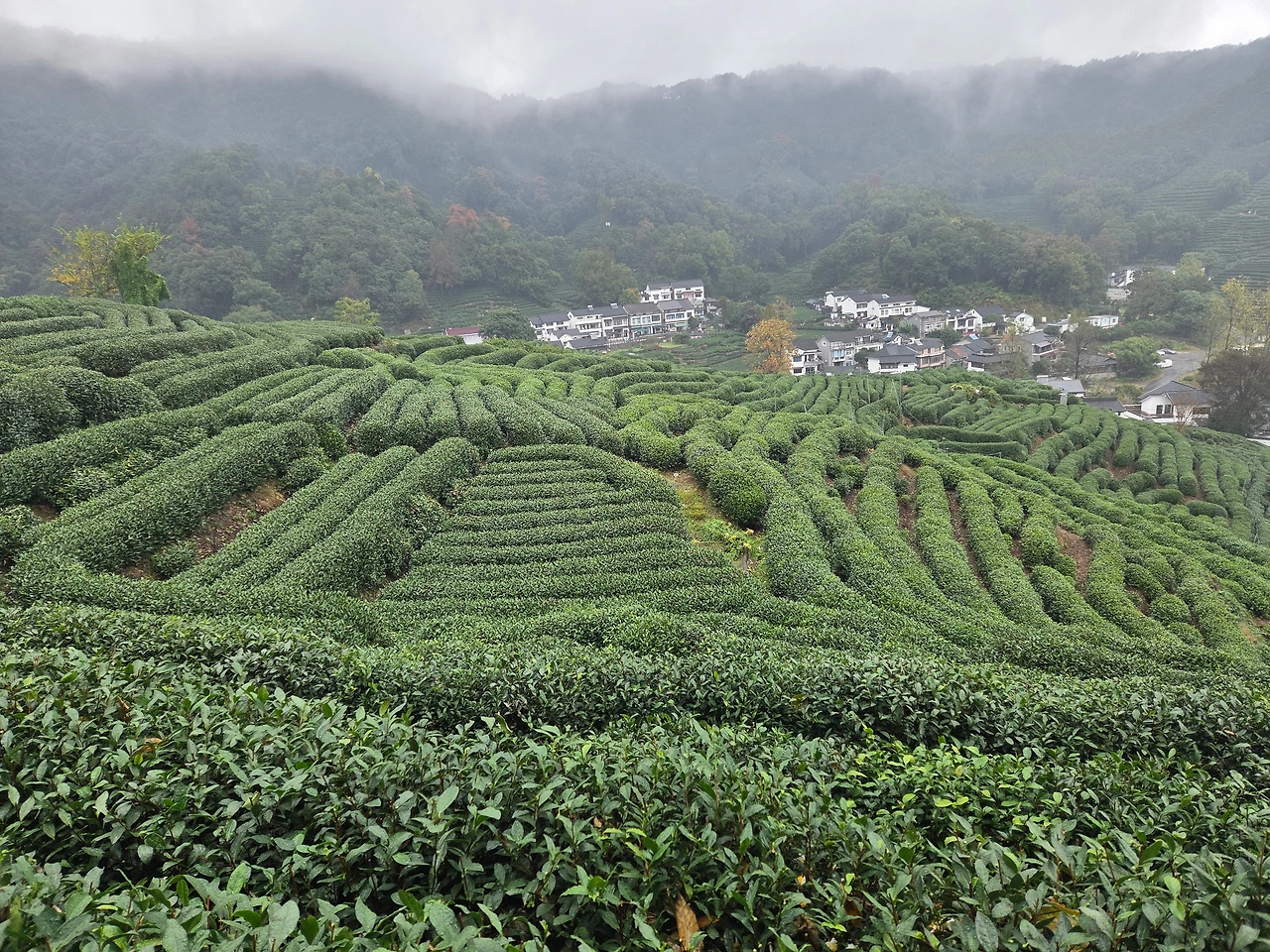 항저우 용정촌 내 산안개 가득한 녹차밭