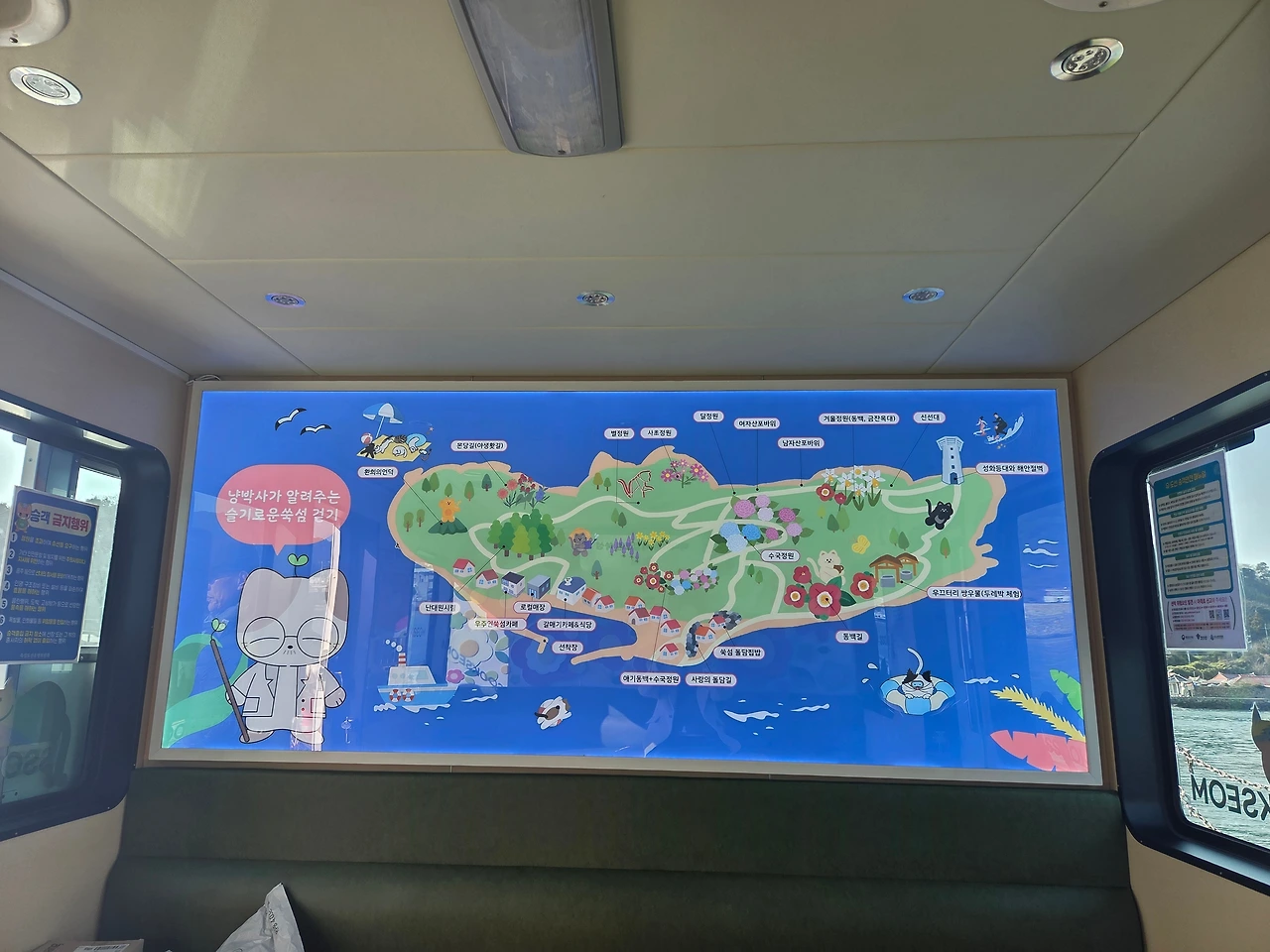 배를 타자마자 실내 좌석에 앉았다. 여유를 좀 느껴보려고 시선을 멀리 두었다. 떠나온 선착장부터 시작해서 멀리 보이는 나로 2대교를 거쳐 고개 한 바퀴 돌리고 나니 벌써 쑥섬 선착장이 코 앞에 있다.