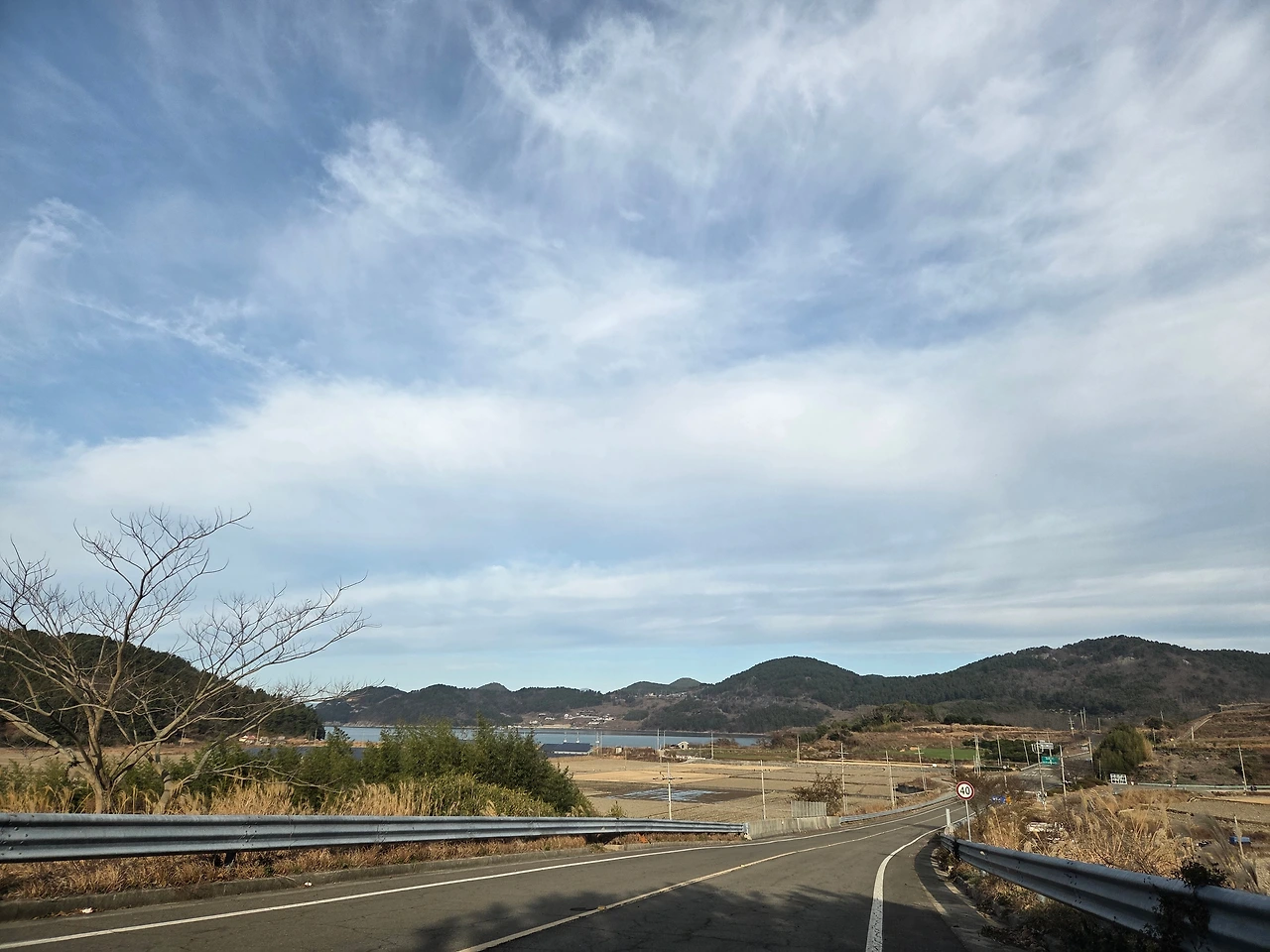 오른쪽으로는 억새밭과 논이 엇갈려 지나고 그 너머 물빛 고운 바다가 잇대어 있는 길이다. 왼쪽으로는 작은 마을들이 드문드문 보이고 길 따라 버스 정류장이 다정해 보였다. 특별할 것 없는 풍경이 얼마나 아름다운지 비상등을 켜고 잠시 도로에 차를 정차했다. 그래봤자 지나는 차가 거의 없었다. '아, 여기서 살면 좋겠다' 병이 또 슬슬 도진다.
