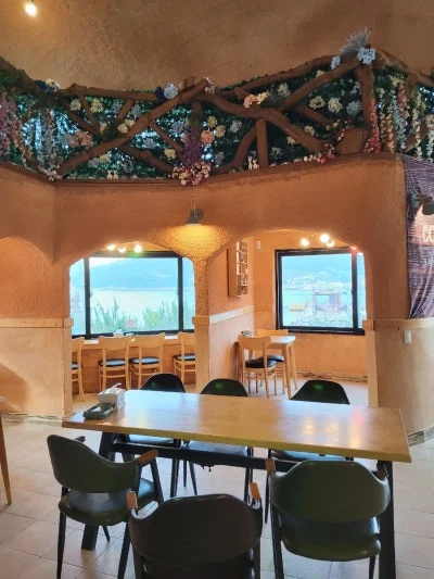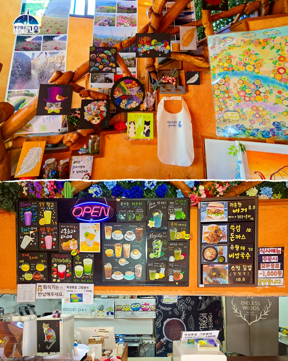 전국 생산량의 60%를 차지하는 고흥 유자향을 기대하며 주문대 앞에 섰는데 커피 향이 그윽하게 먼저 다가왔다. 마음이 잠깐 흔들렸지만 유자차로 결정했다. 테이크 아웃 잔에 가져가겠냐 물었다. 배 시간이 10분 밖에 남지 않았고 다음 배는 5시 배라서 그렇단다. 카페에서 마시겠노라 대답하고 벽면이며 오밀조밀 손이 많이 간 실내 인테리어 구경을 했다. 주인장 말투가 이 지역 출신이 아니다. 부산 출신인데 어쩌다 고흥까지 건너와 살게 되었단다.