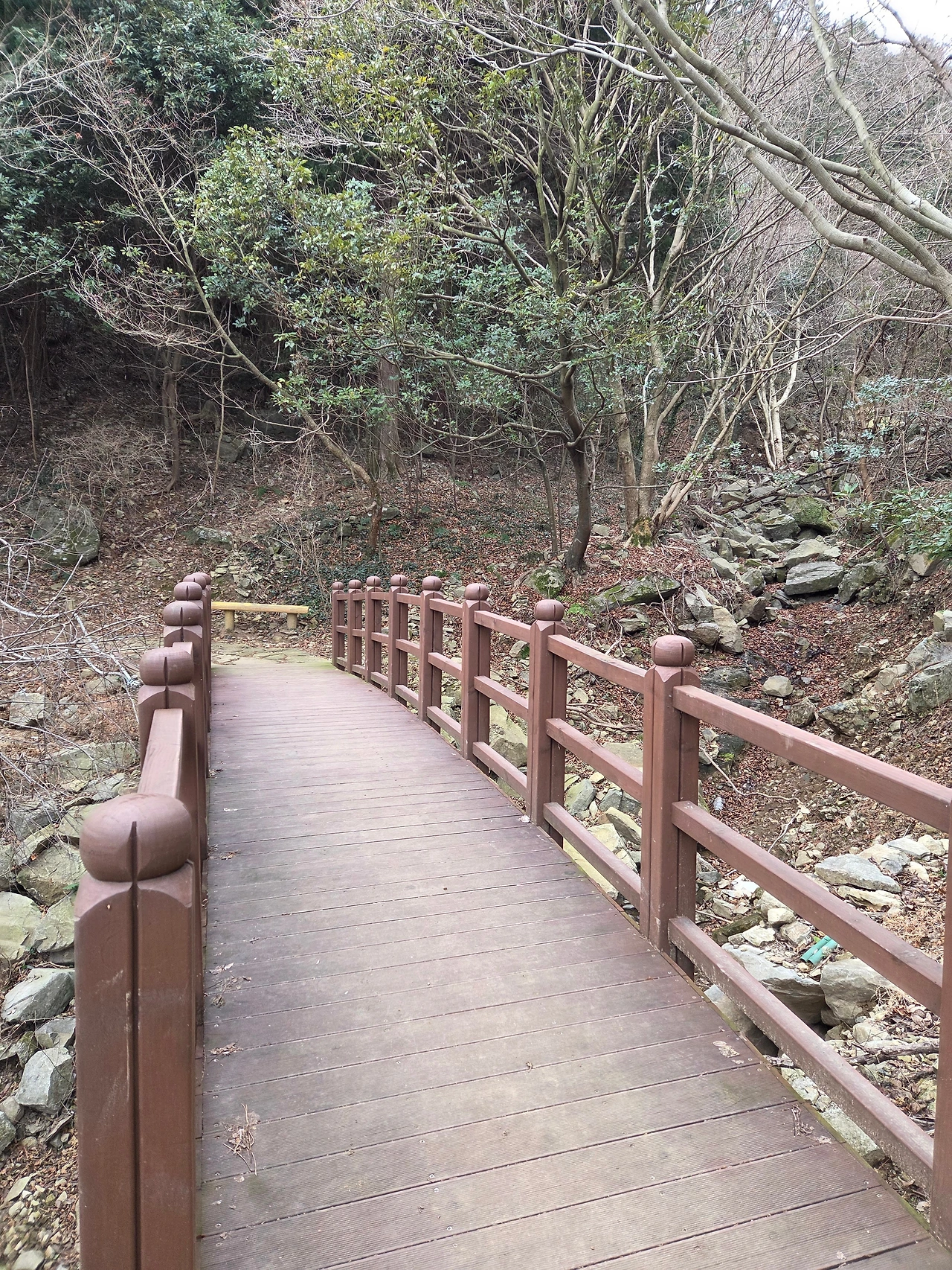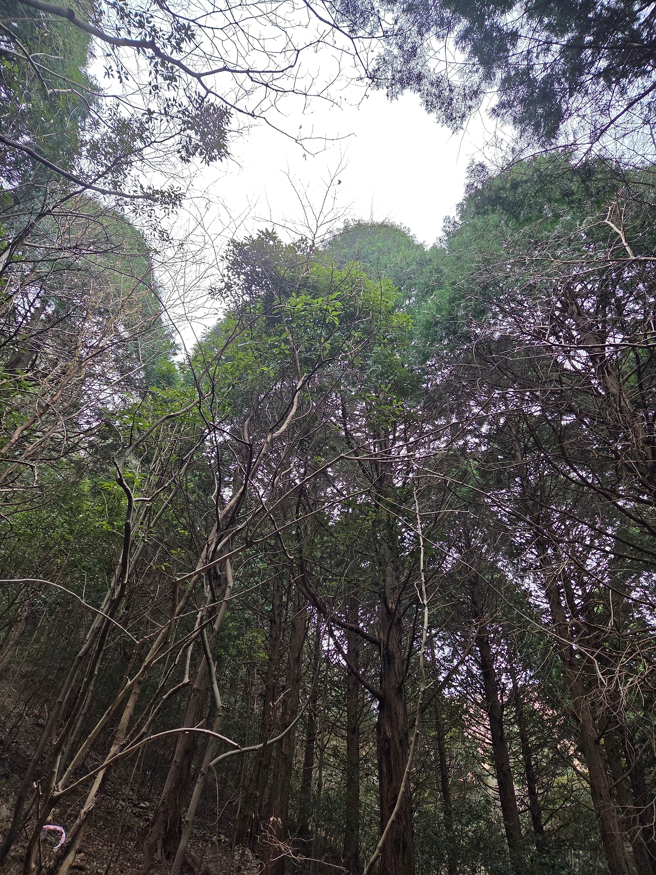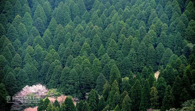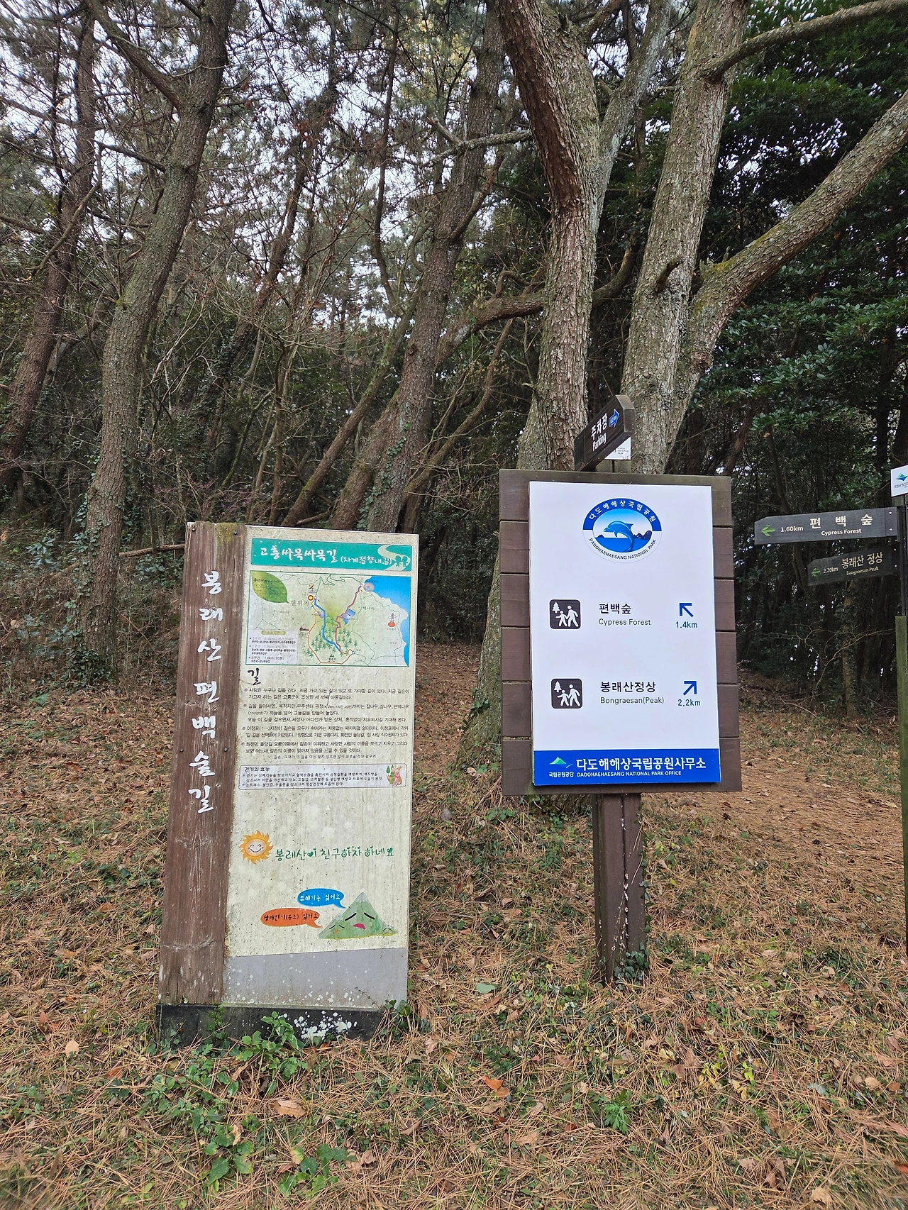 편백숲의 원형을 보려거든 봉래산으로 가라는 말이 있다. 곧 지척에서 삼나무와 편백숲이 시작된다는 걸 냄새로 먼저 알았다. 50미터 전방부터 나무 색깔이 달랐다. 지금이 겨울인가 싶게 푸르렀다. 봉래산이니 쑥 사진도 한 장 찍었다. 피톤치드를 말할 필요가 없다. 100년 넘는 편백이 내뿜는 신선함이 간간히 비치는 햇살 사이로 나풀나풀 춤을 추듯 내린다. 편의시설이 요란하지 않은 걸 보니 관의 관리가 촘촘하지는 않은 모양이다. 오히려 그것이 천연의 자연스러움을 풍긴다. 가지치기를 비껴 난 덕에 위아래 굵기 차이가 커서 원뿔모양 수형이 도드라지고 이것이 장관을 이루었다.