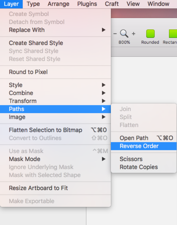 Path가 선택된 채로 Layers > Paths > Reverse Order을 클릭합니다.