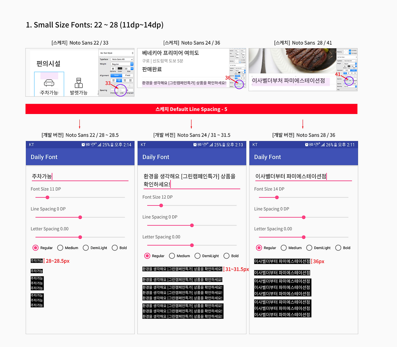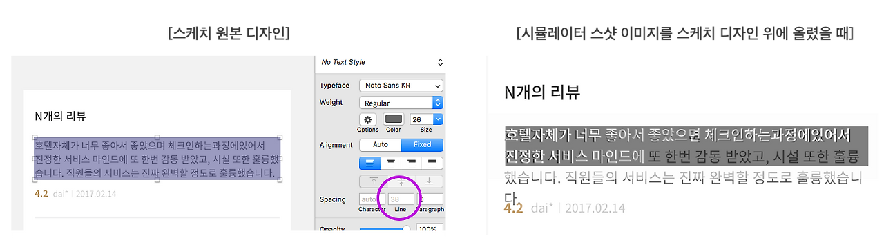 lineSpacingExtra가 적용된 사내 폰트 시뮬레이터 앱으로 저희 서비스 내 사용되고 있는 대표 폰트 사이즈들을 몇 개 테스트로 입력하여 캡처를 뜬 후 스케치로 들고 와 원본 디자인 레이어 위에 얹혀 비교하였습니다.