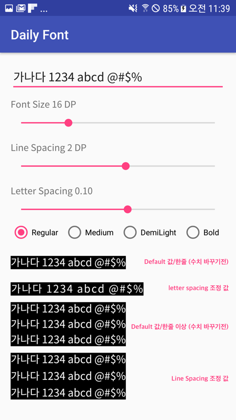 다니는 회사마다 항상 안드로이드 개발자분들께 폰트 시뮬레이터를 간단한 버전으로 만들어 달라고 부탁을 하는 편입니다. 폰트 시뮬레이터 안에는 font size, line spacing, letter spacing을 조절할 수 있도록 되어있습니다. 실제 개발됐을 때의 수치 값을 확인할 수 있어 유용하게 쓰고 있는 편입니다.