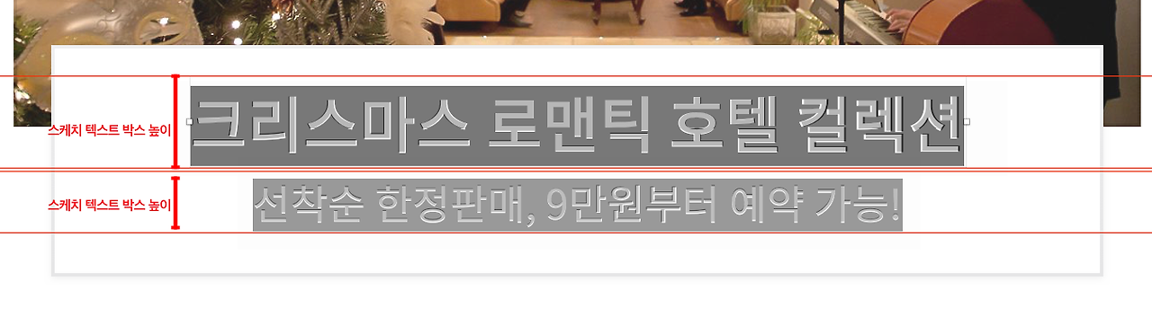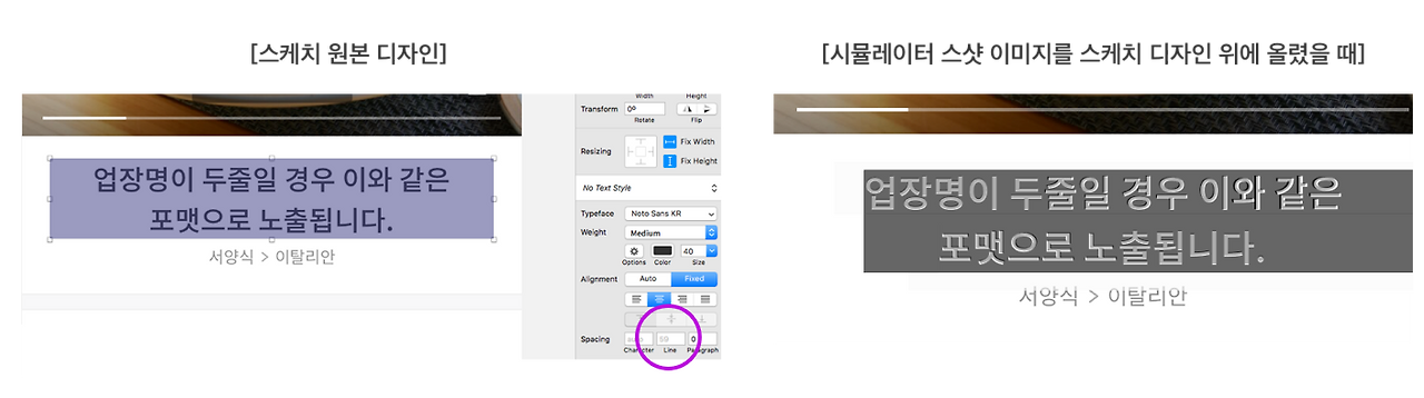 이에 이어, 텍스트가 한 줄 이상일 때도 실제 디자인 위에 얹혀 보았습니다. 스케치에서 제안하는 행간 값과 실제 개발됐을 때 행간 값이 일치하는 것을 확인하였습니다.