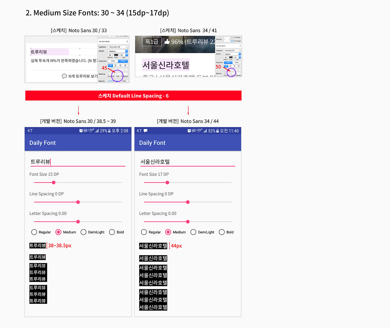아이콘과 이미지와는 달리 행간은 정확한 수치로 전달할 수 있는 개념이 아니기 때문에 스케치로 디자인하면서 정확한 행간을 파악하는 건 불가능합니다. 또한 제일 큰 문제점은 안드로이드에서는 폰트, 폰트 크기마다 가지고 있는 높이가 다르기 때문에 정확한 수치를 파악하기가 더 힘든 것 같습니다. 그리고 디자이너들이 사용하는 스케치와 안드로이드 XML은 서로 사용하는 수치 자체가 다르기도 합니다.