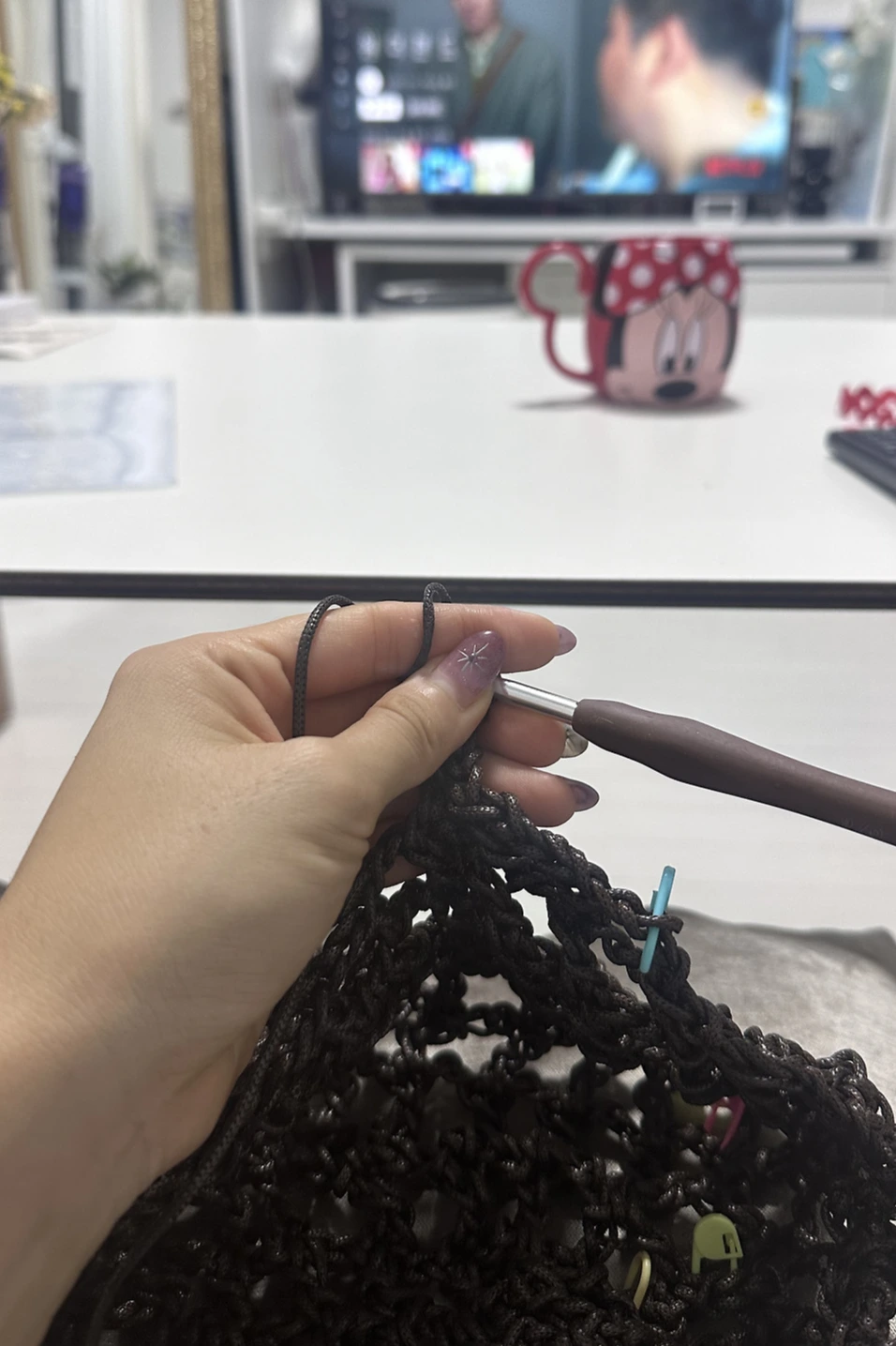 실이라도 멋지면 결과물이 조금 나을까 싶어 가죽처럼 느껴지는 뻣뻣하고 두꺼운 실을 골라서인지 겨우 한 시간 정도 뜨고 나니 손가락이 아파왔다. 이렇게 얇은 실 때문에 손 마디마디가 아파질 수 있다니! 내 가방은 네모 모양을 연달아 떠내는 방식이라 선생님께 배운 1시간치의 지식으로 쭉 뜨기만 하면 됐다. 집에 돌아가는 길 내내 손을 허공에 대고 이리저리 움직였다. 낮 동안 갓 익힌 감각을 잃지 않으려 노력하다 저녁이 되자마자 소파에 앉아 네모 만들기에 열중했다.