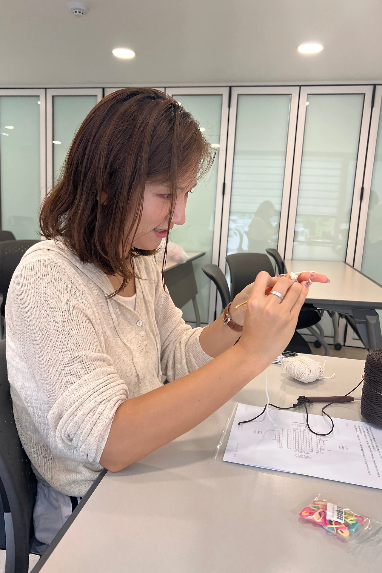 처음이라는 당돌한 대사에도 그녀는 여유롭게 다른 수강생들의 작품을 돌아가며 한참 봐주시고 나서야 마지막 순서로 우리 곁에 앉았다. 서른이 훌쩍 넘었지만 못하는 게 자랑일 수 있는 유일한 공간에서 이것저것 궁금증을 풀어뒀다. 어떤 질문에도 그녀는 막힘없이 현답을 툭툭 내놓았다. 예를 들자면, 내가 엉키면 어떡하냐고 물으면 그녀는 풀면 되죠? 정 안 풀리면 자르고 다시 실을 연결해 시작하면 되고요! 하는 단순 명쾌한 답을 내놓았다.