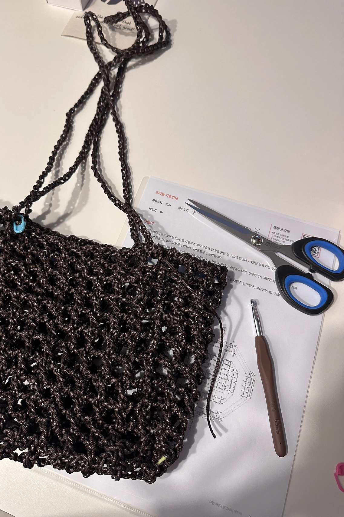 가부좌 자세로 한참을 미동 없이 빳빳이 앉아있어 두 다리에 피가 안 통하는 느낌이 들고서야 일어섰다. 굳은 허리를 움직이며 침대로 향했다. 침대에 누워서도 눈앞 천장으로 내 손과 그 손에 얽힌 실타래가 환영처럼 보였다. 밤마다 잠을 쪼개 서너 시간씩 뜨고 나니 첫 수업을 들은 지 겨우 3일 만에 가방의 모양이 완성됐다. 힘조절이 부족해 어떤 부분은 촘촘하고 도톰한데 또 어떤 부분은 성기고 죽죽 늘어나버리는 어설픈 가방, 분명 도안과 같은 방법으로 떴는데 결과물은 사뭇 달랐다. 그렇지만 세상에서 하나뿐이라 생각하니 자꾸만 애정이 갔다. 한 줄 한 줄 떴을 때의 내 감정과 감각을 온전히 알 수 있는 작품이라니 얼마나 귀한가.