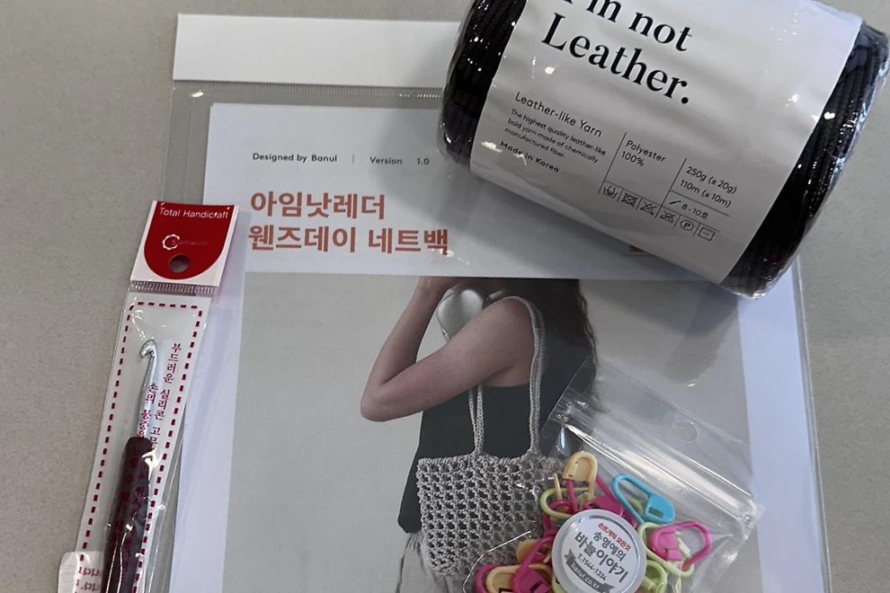 첫 수업에 내가 고르고 고른 작품은 가방. 코바늘의 세계에선 아주 기본적인 단위인 ‘사슬뜨기’와 ‘두줄뜨기’만 할 줄 알면 끝낼 수 있는 가방이었다. 사슬뜨기란 바늘로 새로운 실을 끌어와 기존에 걸려있던 코와 함께 두었다가 사슬 모양으로 빼내는 것, 두줄뜨기는 이 사슬을 2번 연달아 만들어 기둥처럼 만드는 방식. 앞으로 여러 차례 등장할 이름들이니 기억해 두시길.