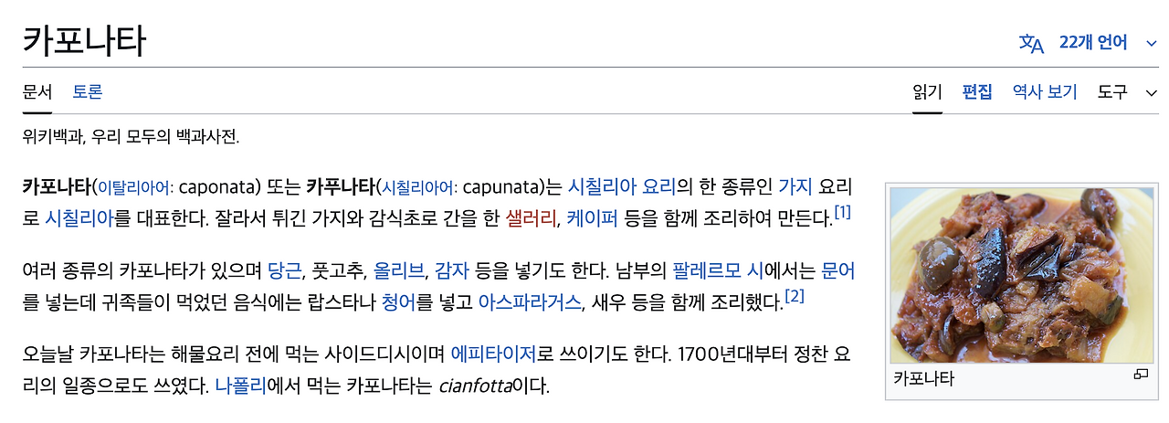 시칠리아 음식으론 주로 '카놀리'나 '아란치니' 또는 해산물 요리 정도가 널리 알려져 있는데 현지에서 생각하는 '시칠리아의 주요 음식'으론 카포나타를 빼놓을 수가 없다. 그래서인지 많은 수의 레스토랑에서 코스 요리에 기본으로 넣어 제공하거나, 오늘의 메뉴 등으로 제공하고 있어 눈만 크게 뜨고 본다면 시칠리아 어디에서든 쉽게 맛볼 수 있는 메뉴다.