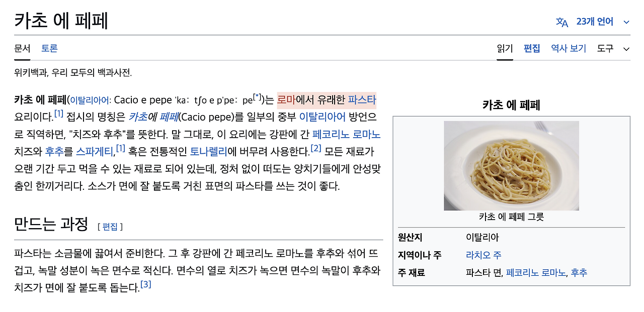 로마는 이탈리아 전역을 기준으로 중부에 위치한다. 이탈리아 모든 문화의 중심지이자, 매년 최다 관광객을 품는 도시답게 여행자 친화적인 도시 문화를 가진다. 덕분에 로마에서는 이탈리아 전역의 음식 대부분을 경험할 수 있는데 그중에서도 아래 두 개의 메뉴는 로마가 단연 최고라고 자부할 수 있다.
