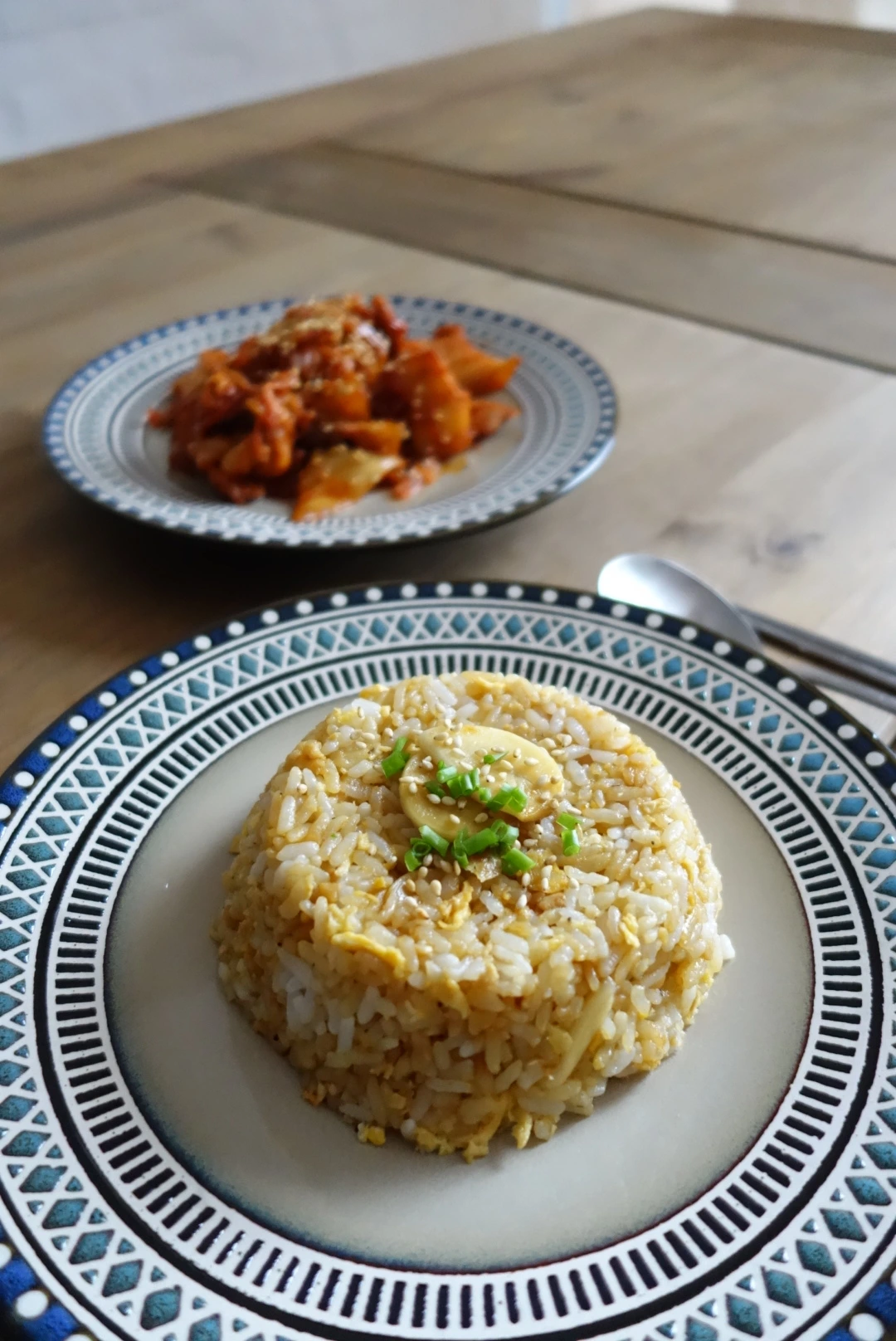 밥공기에 한 번 꾸욱 눌러 담겼다가 뒤집어엎어 넓은 접시에 옮겨 담아진 볶음밥은 '마늘볶음밥'이라는 아이덴티티를 당당하게 밝히기라고 하겠다는 듯이 정상엔 의기양양하게 편마늘 두 쪽이 올라가 있다.