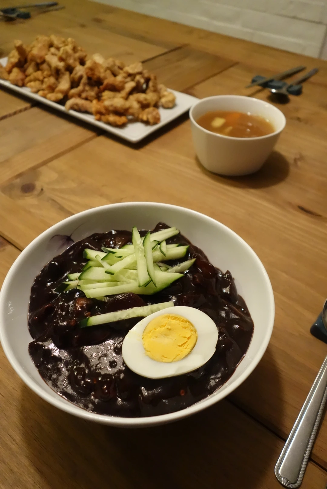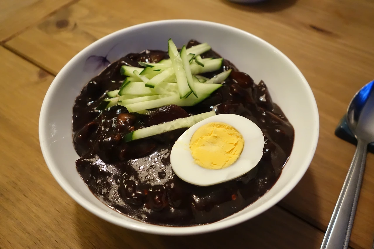 면을 삶아 짜장 소스를 얹고 그 위에 완두콩이든 오이든 그마저도 없으면 파라도 썰어 올려야 비주얼이 완성된다. 삶은 달걀은 클래식하고 계란 프라이는 트렌디하니 취향껏 올리자.