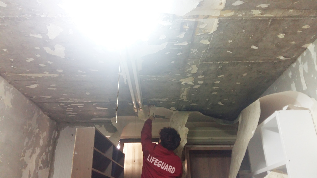 하지만 다시 몇 분 후, 천장을 보니 굳이 그렇게 가려야 하나-라는 생각이 들었다. 보고 보고 또 보니 어쩜, 저 거침이 그렇게 멋있게 보일 수가 없었다. 결국 페인트를 칠해보고 결정해보자-하고서 열심히 핸디코트로 이곳저곳을 채워갔다.