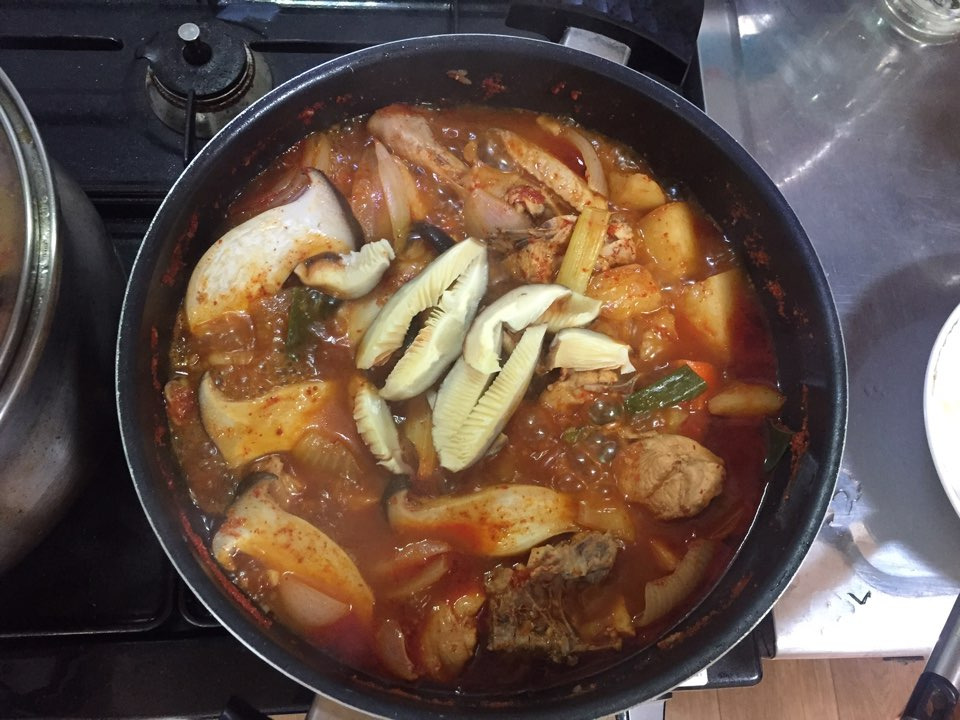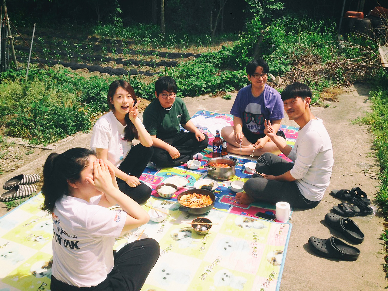 자유탐험가의 처음 해본다는 닭볶음탕은 매운맛과 덜 매운맛으로 8인분이 넘은 듯 많았는데 금세 바닥을 보였다. 다들 감탄에 감탄을 더하며, 쫄깃하게 씹히는 버섯과 매콤한 국물, 닭고기에 흠뻑 반해버렸다. 거기에 산산이 부는 바람과 초록촉한 풍경까지! 와우!