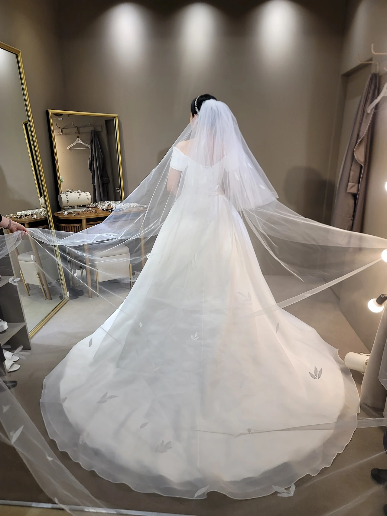 드레스를 피팅하면서 샵 직원분들께서 이런저런 이야기를 해주셨다. 임신을 하면 확실히 허리선부터 도톰해지는 것 같다며, 이게 아무래도 앞으로 나올 배를 지탱하기 위해서 허리힘부터 키우는 것 같단 이야기에 그나마 볼만했던 내 허리선이 사라진 이유에 대해서 드디어 깨닫게 되었다. 피팅 내내 샵 직원분들께서는 매우 섬세하셨다. 혹여나 허리가 조여 숨이 답답하진 않은지, 어지럽진 않은지, 또 틈틈이 물을 마실 것을 권해주셔서 편안한 마음으로 드레스 피팅을 마쳤고, 최종 드레스를 골랐다. 나에게 어울리는 지와, 피팅감이 갑갑하지 않은지, 그리고 밝고 꽃장식이 많은 웨딩홀 분위기를 고려하여 하얀 실크 오프숄더 드레스로 나와 남자친구, 그리고 플래너님 만장일치로 깔끔하게 선택했다.