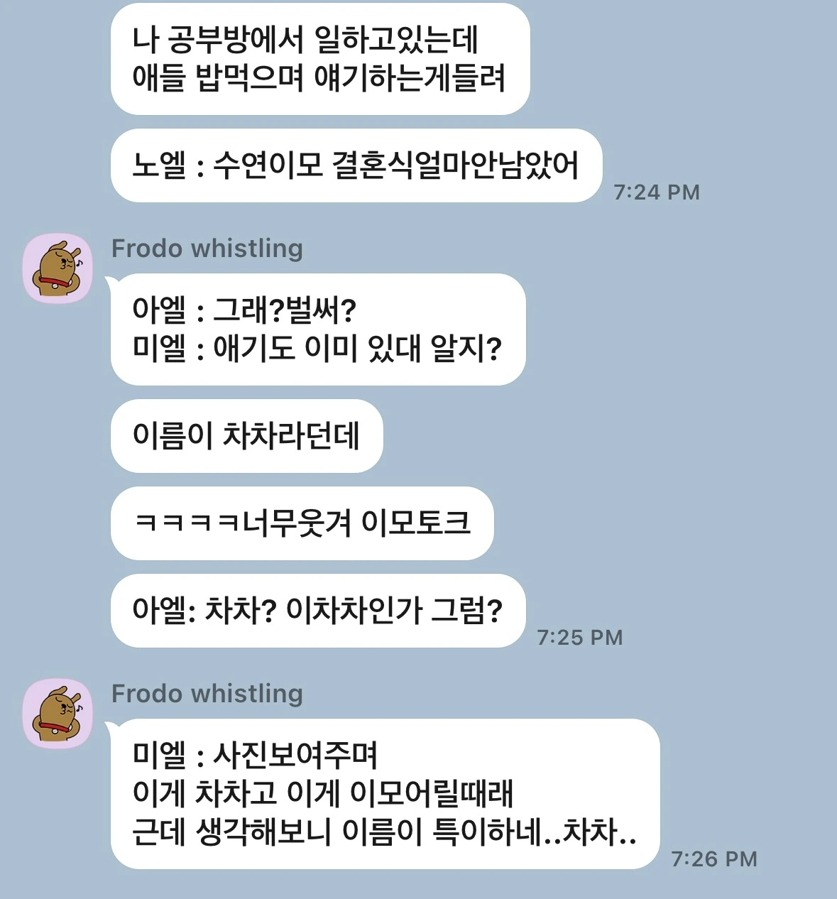 아직 ‘차차’가 아기의 태명이라는 걸 모르는 조카들이 이름이 특이하다고 이야기했다는 카톡에 나와 남자친구 둘 다 모두 빵 터졌다. 내가 아는 세상 사람들 중 가장 이름이 특이한 세 명이 차차의 이름이 특이하다고 웃는다. 며칠 내내 툭하면 이 대화가 떠올라서 피식피식 웃었다.