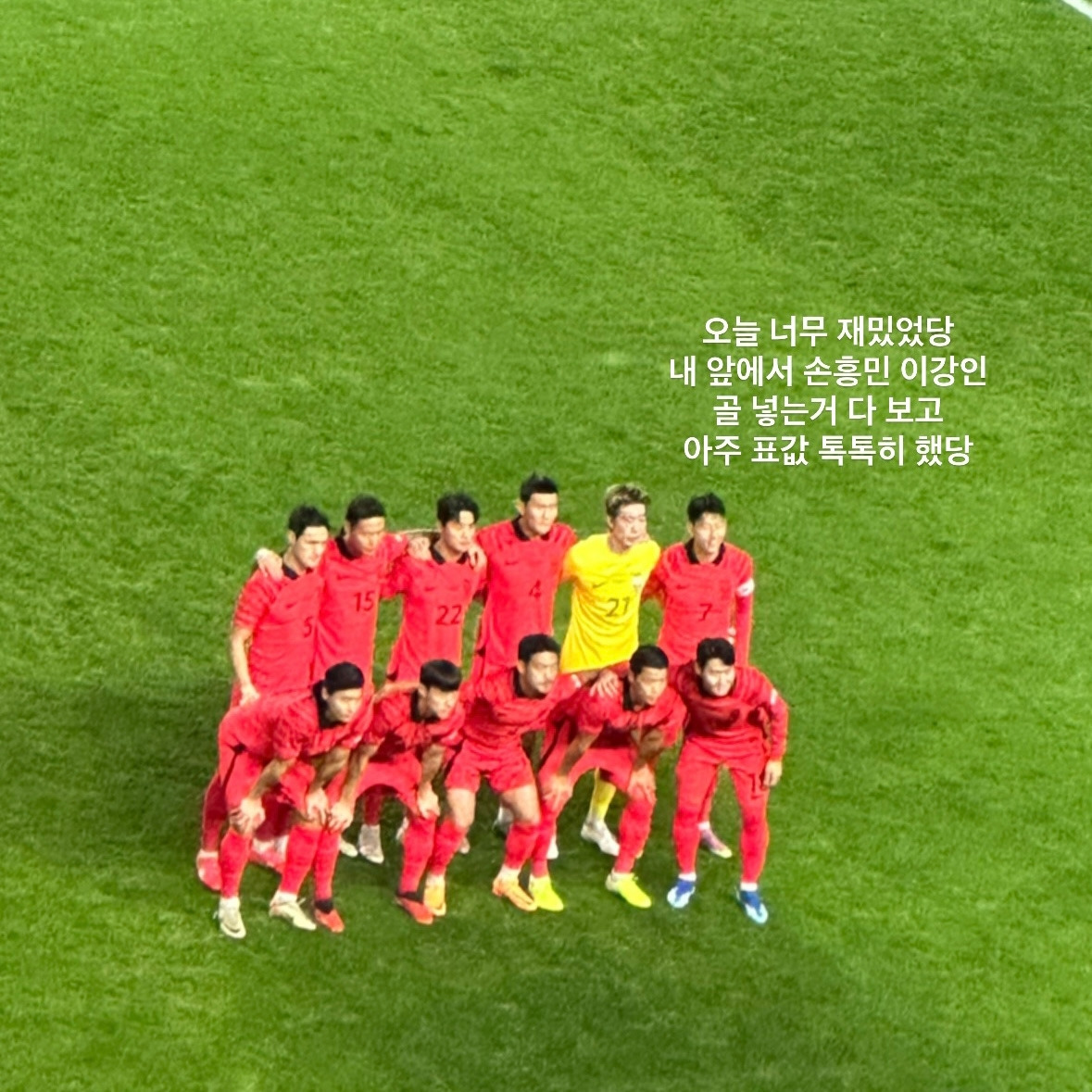 경기 30분 전 입장하여 선수들이 몸 푸는 광경부터 보기 시작했고, 드디어 경기가 시작됐다. 오랜만에 방문한 축구장은 해설이 없어 초반엔 다소 어색했으나, 금방 응원소리와 환호성으로 가득 찼다. 축구장이 시야가 굉장히 트여있어서 공도 선수들 얼굴도 오히려 TV 중계보다 잘 보이자, 남편도 금방 신나 하기 시작했다. 이날 경기는 무려 6골이나 넣었고, 그러다 보니 골이 들어갈 때마다 모두 일어서서 환호하고, 귀에 익숙한 여러 응원송이 울려 퍼지고, 또 파도타기를 시작하자 신나서 참여하며 환호하고 사진 찍는 남편을 보며 굉장히 뿌듯했다. 남편의 친구들에게도 이미 문자와 사진으로 자랑을 하고 있었고, 부러워하는 친구들의 반응을 보며 더 신나 진 것 같았다. 치킨과 맥주를 함께 못해서 아쉬웠지만 직관의 매력을 충분히 느낄 수 있는 기회였다.