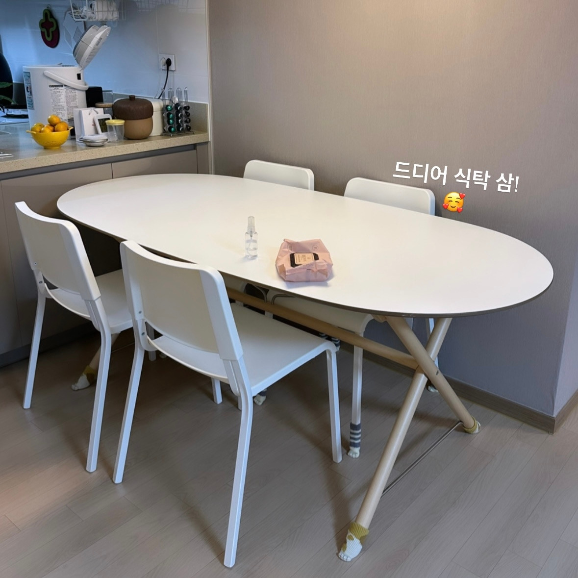 내가 늘 갖고 싶었던 완벽한 모양의 테이블이 이케아에서 팔고 있었고, 단종 예정인지 ‘마지막 기회’라는 말이 붙어있었고, 2주 뒤 우리 집에서의 집들이가 잡혔다. 이제 더는 늦출 수 없었기에 후다닥 이케아에서 주문을 했고, 오자마자 조립을 해서 앉았다. 비싸고 좋은 테이블과 의자는 아니었지만 마음에 쏙 들었다. 하얗고 둥글어서 안전해 보였고, 상판이 오염에 강해 쓱쓱 닦기 좋았다. 또 방향을 바꿔서 식탁에 앉아서도 거실과 주방으로의 시야가 트였더니 한숨 더 넓어진 느낌이었다. 아이러니하게 테이블은 커졌는데 넓고 밝아졌다. 바로 다음날부터 테이블에 앉아 듣고 있는 문화센터의 수업 숙제와 아이패드 일기 쓰기, 다이어리 정리 등등 잡다한 일을 하기 시작했다. 나도 모르는 새 두 시간 반이 훌쩍 지난 걸 깨닫고 놀랐다.