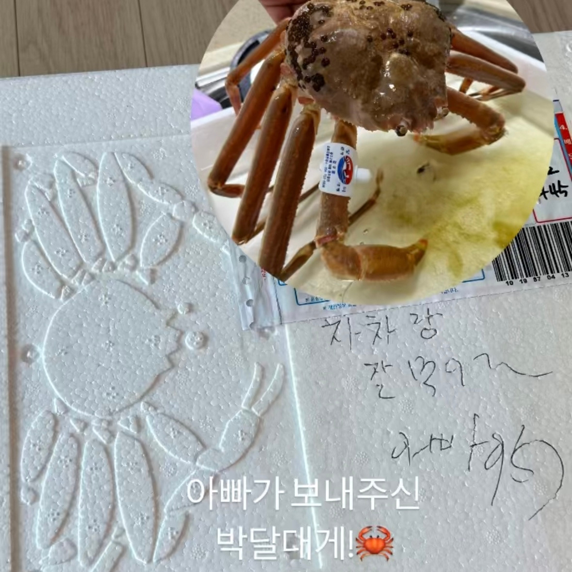 이렇게 임신 10개월 막달을 감기, 갈비뼈 골절, 코로나로 꼬박 채우며 4주를 보냈다. 외출도 하지 못해 체력도 많이 떨어지고 우울감과 무력감이 굉장히 심하게 들었다. 코로나 3일 차가 되고 몸이 조금 나아졌을 때, 타이밍 좋게 아버지께서 영덕에 가서 직접 고르신 박달 대게를 집으로 보내주셨다. 아빠가 걱정하실까 봐 아프다는 이야기는 하지 않은 상태였는데, 내가 제일 좋아하는 음식이 ‘게’여서 직접 가서 사서 보내주신 거였다. 감기가 길어지며 속이 메슥거려서 한동안 잘 못 먹었는데, 박달대게를 보자 재작년에 아빠와 단둘이 영덕 여행을 가서 맛있게 먹었던 박달대게 생각이 났다. 아빠도 그 여행을 매우 좋아하셨는데, 생각이 나서 사다 주신 것 같았다. 크고 살이 튼실해서 수율이 좋고 맛도 좋은 박달대게를 열심히 먹고 낮잠을 푹 자자 거짓말처럼 열이 안 나기 시작했다. 아빠의 사랑이 떠오르고 부모의 마음이 조금씩 이해가 가기 시작했다. 결혼도 늦게 하고 노산이 가까운 나이에 임신을 했는데도 다 커서 임신을 한 내 모습이 기특하다고 하던 아빠의 모습이 떠올랐다. 내가 몇 살이건 상관없이 아빠의 눈에는 아직도 내가 애처럼 보이는 것 같다. 임신을 하고부터 아빠의 반응이 늘 뭉클했다. 이런 부모의 마음을 나도 차차를 보며 느끼게 되겠지.