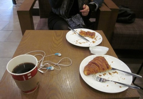이른아침 김이 모락모락 나는 커피한잔과 크루아상은