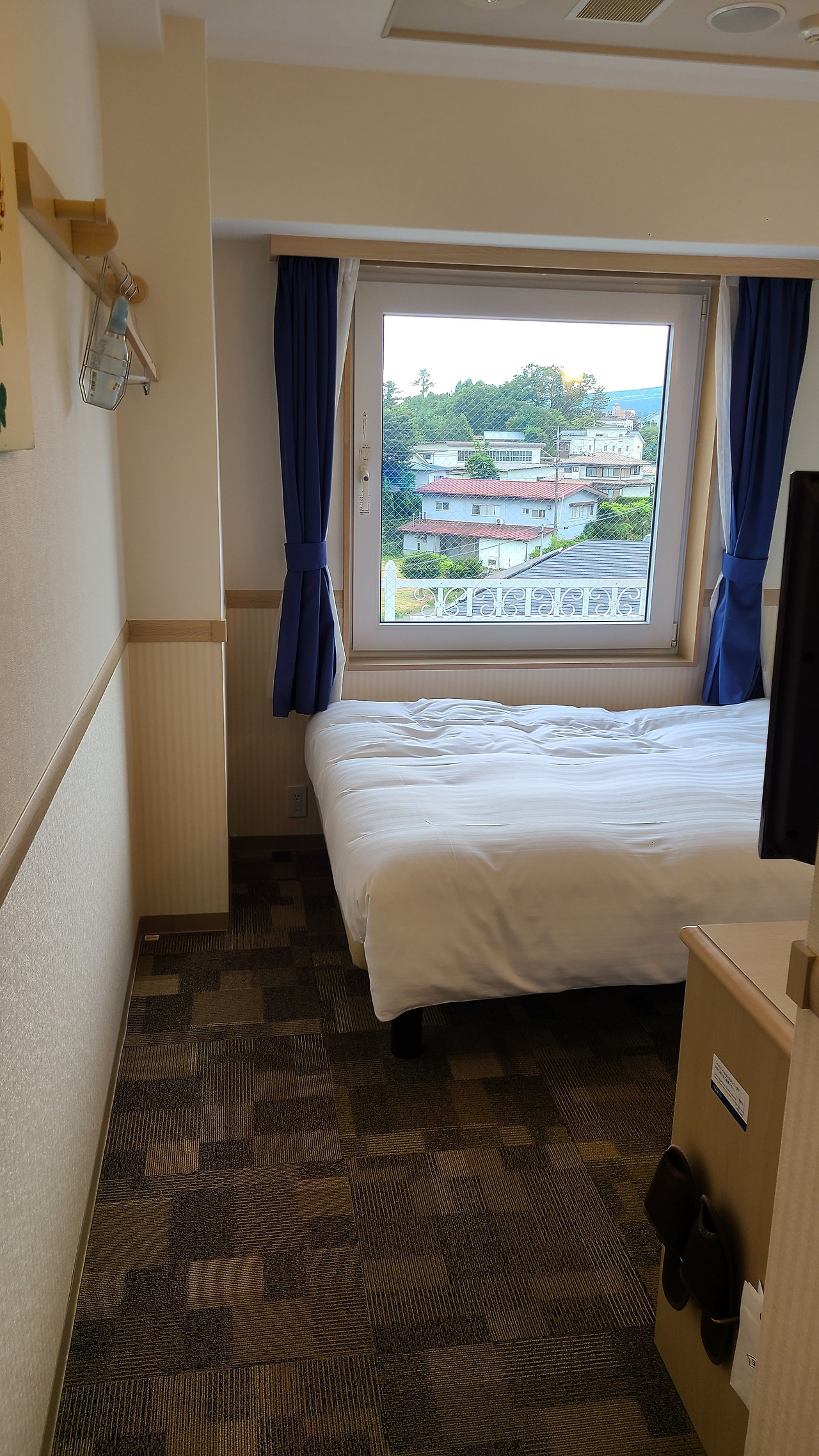 역에서 1km 정도, 호수까지는 500m 떨어진 호텔은 두 개의 동이 있을 정도로 규모가 상당했다. 지어진 지 5년도 되지 않은 신식 건물이었고 체크인을 할 때에도 셀프로 여권을 스캔하는 방식이었다. 바로 전날 있었던 호텔과 여러모로 많이 비교가 되었다. 나는 불꽃놀이 3주 전쯤 예약을 했는데 그때 이미 싱글룸을 제외한 모든 방이 이미 매진이었고, 얼마 되지 않아 싱글룸도 매진이 되었다. 규모가 그렇게 큰 호텔의 방이 모두 매진될 정도면 얼마나 많은 사람들이 그날 가와구치호수 근처에 머무는지 짐작할 수 있었다.