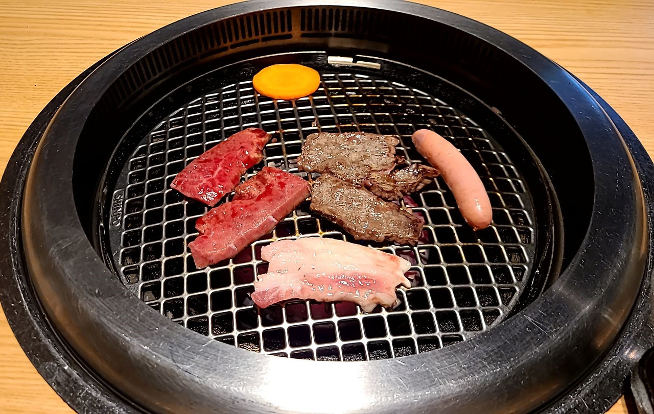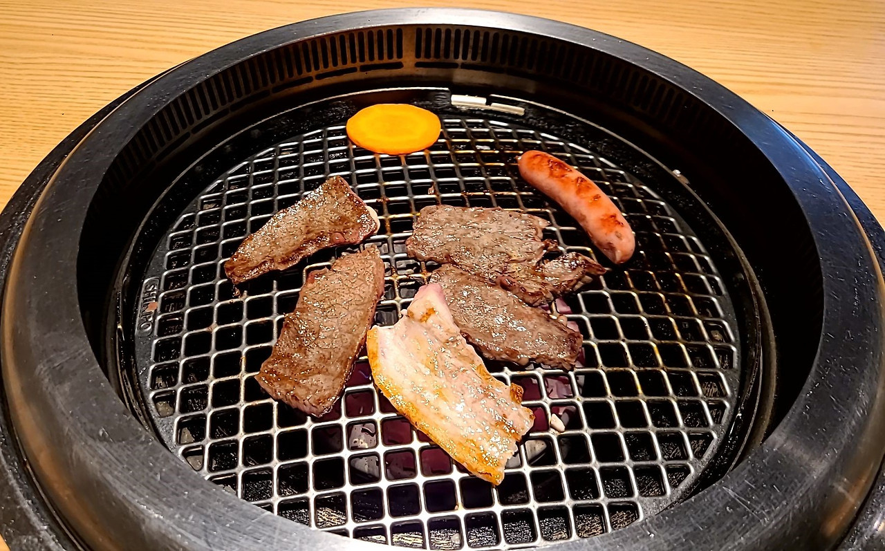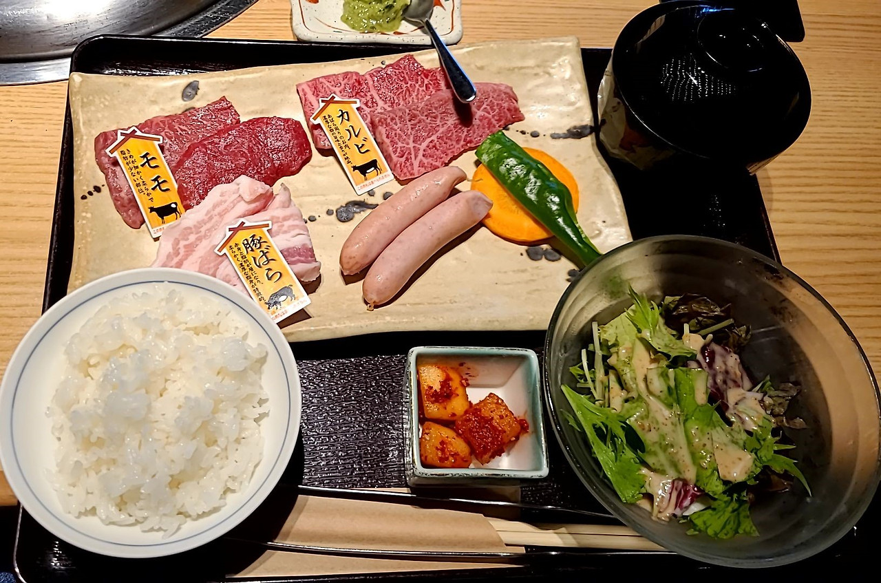 오후 12시 반 즈음 2층에 있는 고깃집으로 올라갔다. 내부는 몹시 세련되어서 고깃집이라는 느낌보다는 패밀리 레스토랑과 일식집을 적절히 섞어놓은 것 같은 분위기였다. 평일 점심시간이라 여유 있었고, 눈치 볼 것 없이 직원이 안내해 주는 대로 6명은 앉아도 될 것 같은 큰 테이블에 혼자 앉았다. 1500엔짜리 런치세트에는 밥, 깍두기, 샐러드, 국, 소고기, 돼지고기, 소세지 두 개, 음료수(콜라, 사이다, 커피 등)가 포함되었다. 진정한 가성비 메뉴였다. 주문한 지 얼마 안 되어서 고기가 나왔는데 사진에서 본 것과 완전히 똑같이 나왔다. 고기의 신선함, 고기의 양, 반찬의 양 모두 본 그대로였다.