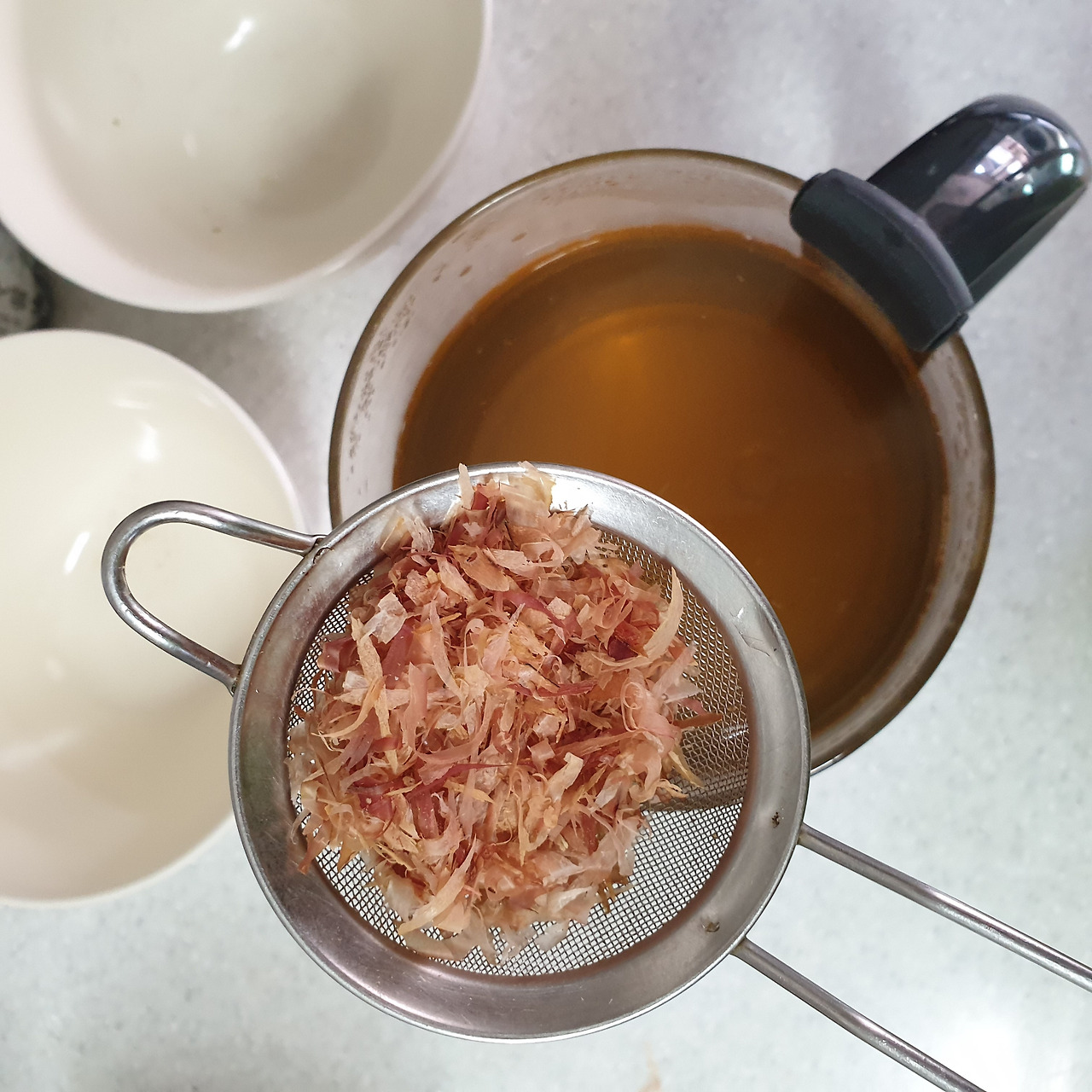 2_우려 둔 녹찻물에는 쯔유나 액젓을 조금 넣어 간을 맞춘다.액젓은 향이 좀 셀 수가 있어서 저번에 선물 받은 가리비 간장을 넣어주었다. 그리고 가쓰오부시와 다시마도 함께 우려내 주었다. (가쓰오부시도 길게 넣어두면 쓴 맛이 날 수 있어 체에 걸러 국물만 우려내고 빼주는 것이 좋다.)