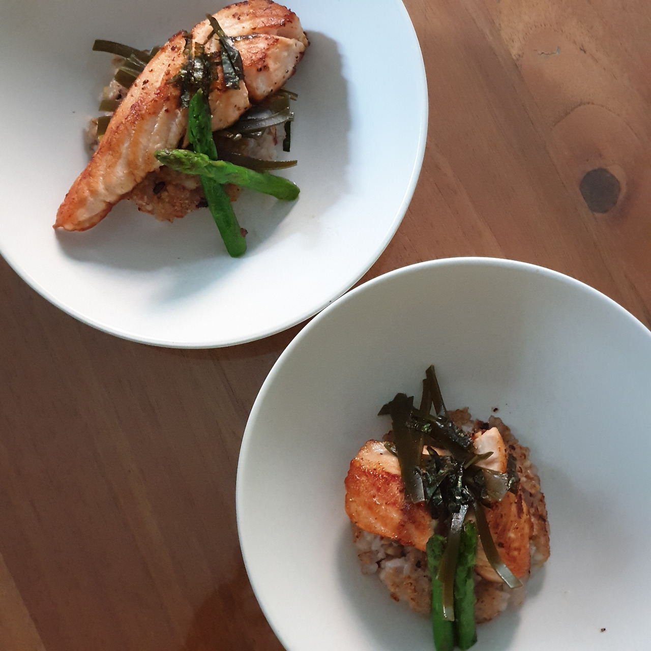 6_밥 위에 연어와 아스파라거스를 살포시 얹고 김가루를 뿌려주면 끝.