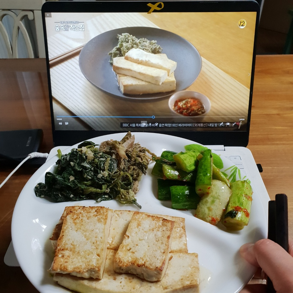 땅두릅을 쪄서 된장에 조물조물 무친 두릅나물, 시금치를 3단이나 사는 바람에 그린스무디용 시금치, 시금치 카레를 만들고도 남아 들깨가루와 간장에 살짝 무친 시금치나물, 오독오독 먹기 시작하면 잘 멈추지 못하는 오이무침 까지 골고루 그릇에 담아 놓고 두부를 부쳤다.