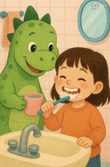 놀랍게도, 애들이 양치를 2분 동안 진지하게 하고 있는 거다. 캐릭터가 불을 뿜고, 효과음이 나올 때마다 더 열심히 닦는다.