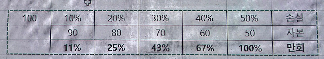 자 7억... 30% 손실. 이때부턴 진짜 힘들어진단다. 30% 잃었는데 43% 수익을 봐야 본전이란다. 즉 20% 잃었을 때 이성을 차리고 현금화나 절반은 월배당 etf에 넣고 재정비를 해야 한다는 거지. 30% 손실일 때는 복구가 정말 힘들어진단다.