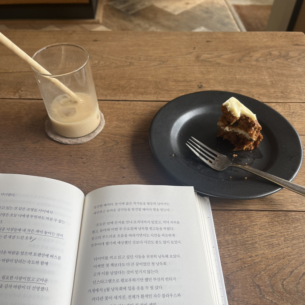 가져온 책을 읽었다. 문장 하나하나 너무 소중해서 페이지를 넘기는 게 아쉽고 더뎠다. 아쉬울 때마다 괜히 포크로 당근케이크를 건드렸다. 좋았던 문장만큼 쉽게 떠지지 않던 케이크. 떠나기 전의 촘촘한 시간들이 아주 달콤하고도 애틋하게 날 응원하고 있었다.