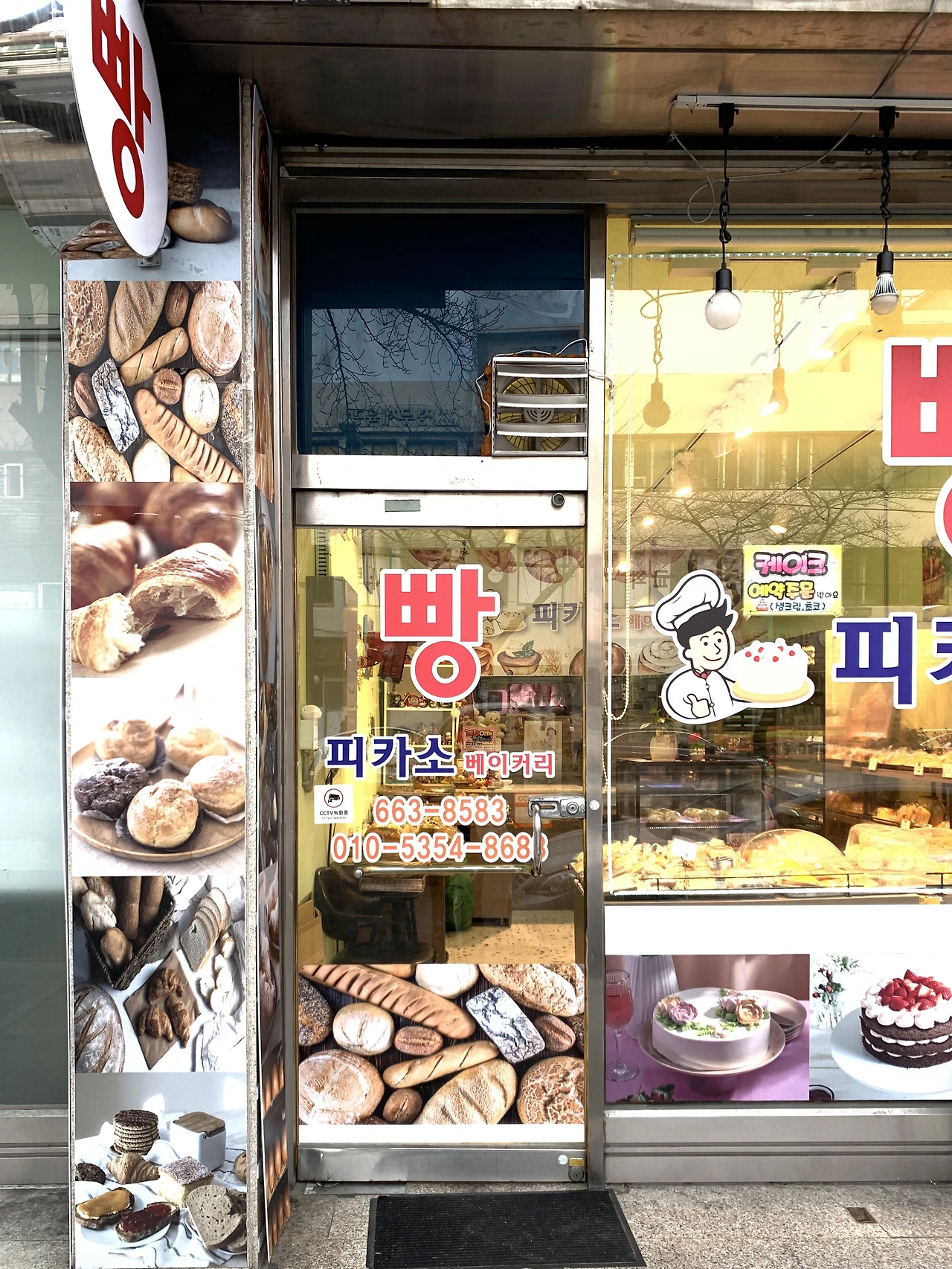 과감히 돌아서 여수터미널까지 천천히 걸어갈까 하던 찰나, 동선에 마침 가볼까 말까 고민하던 <피카소베이커리>가 보여 발길을 돌렸다. 외관은 아주 오래된 느낌도, 그렇다고 지나치게 현대적이지도 않았다. 차분한 빨강과 파랑의 조합이 기분 좋았고, 정사각형 창 가장자리를 장식한 전구줄이 귀여웠다. 외벽에는 빵과 케이크 POP 이미지가 가득했고, ‘빵’이라는 글자의 반복은 한눈에 봐도 여기가 빵집임을 알려주었다.
