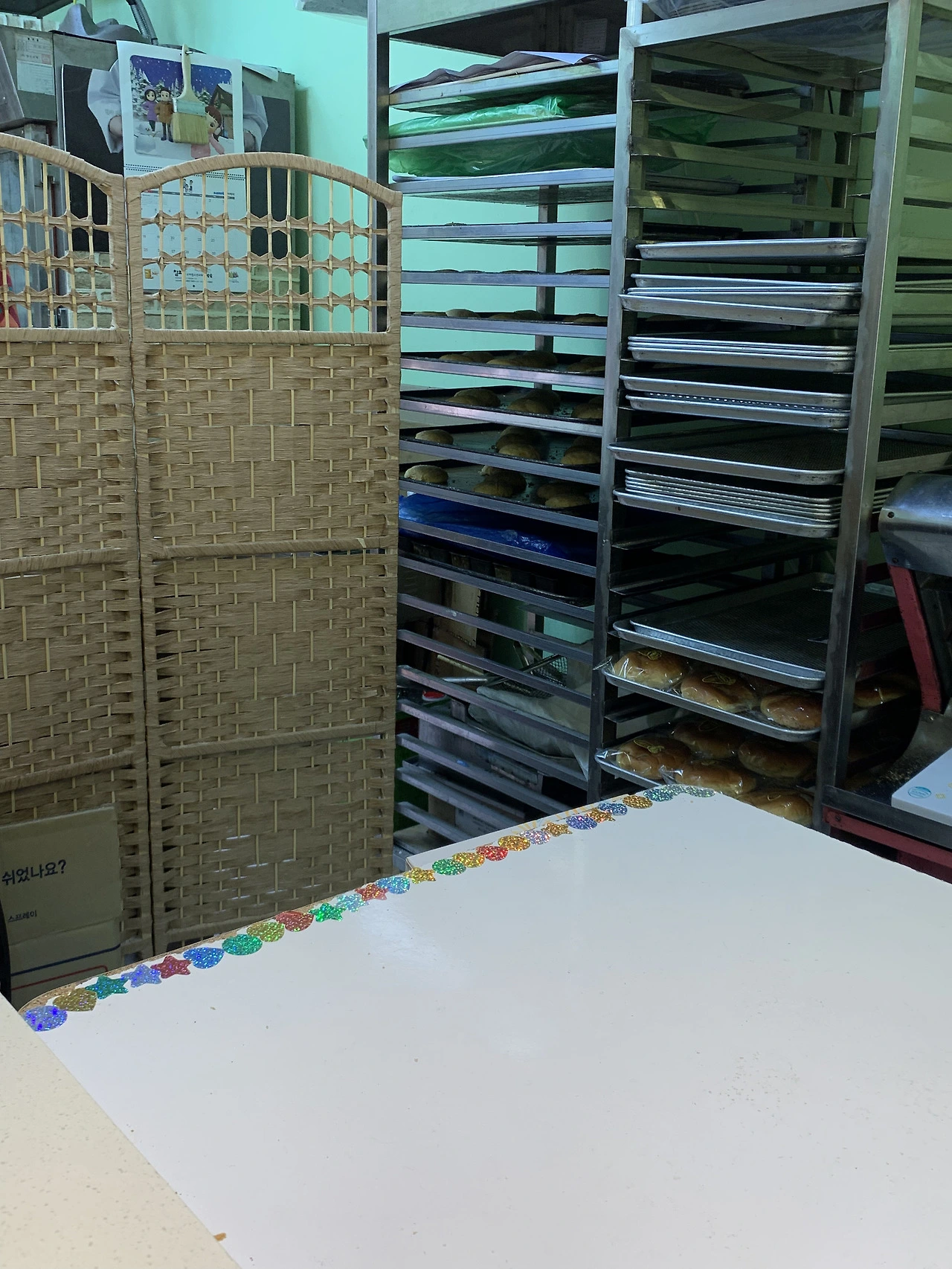 - 케이크와 빵 POP 이미지, 글자 시트지, 전구줄이 과하지 않으면서도 되려 깔끔하게 어우러짐