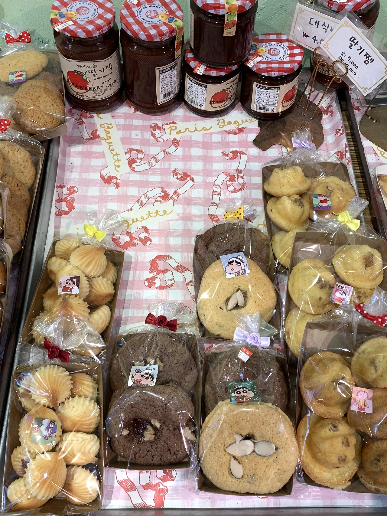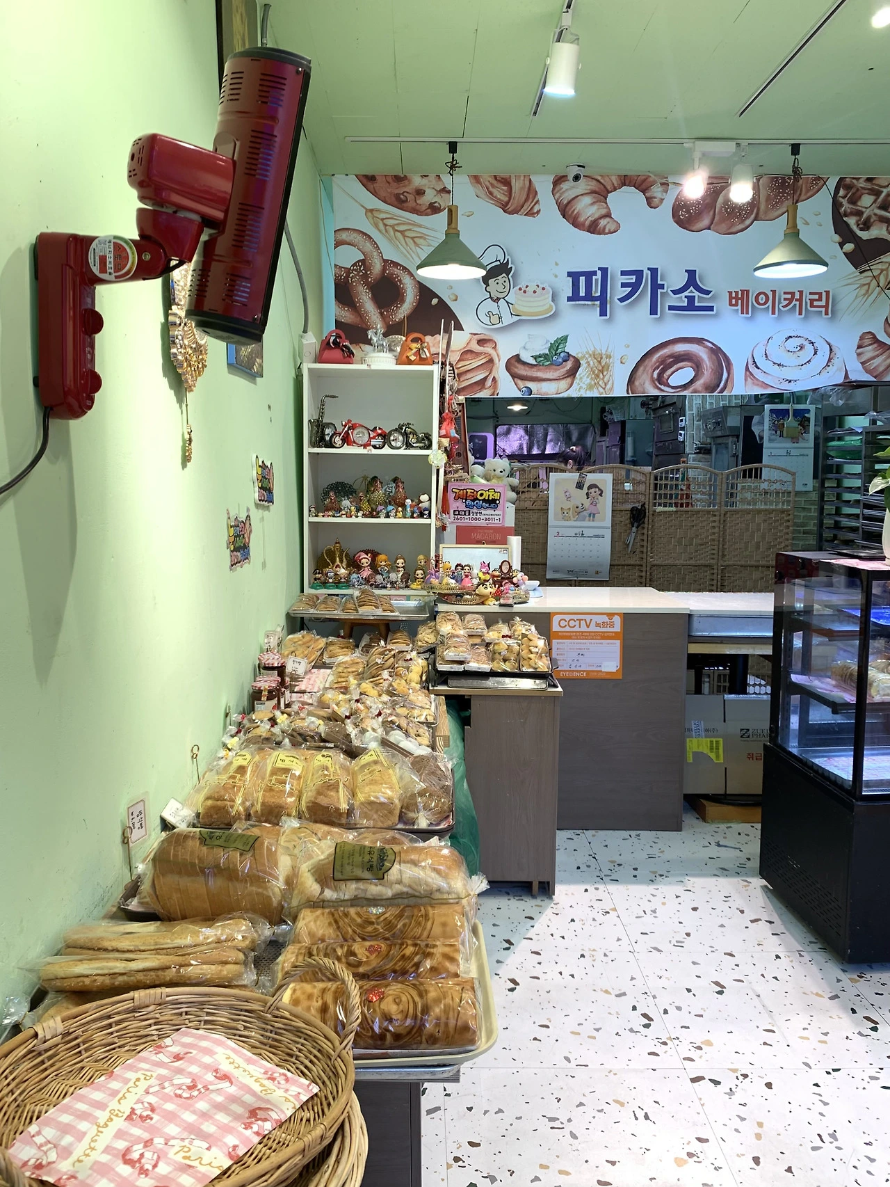 빵 봉투마다 붙은 캐릭터 스티커(짱구, 마루코 등), 선반 곳곳의 인형과 명화 액자, 생화와 조화, 현수막, 장난감과 골동품들. 보는 재미에 눈이 바빴다. 장식품이라고 단정하기보다는 ‘그냥 있는’ 생활 소품이라고 부르는 편이 맞겠다. 집 안 어딘가에 자연스럽게 놓여 있는 것들처럼.