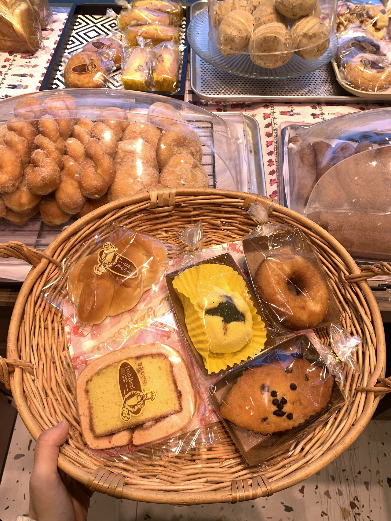 - 메인 컬러 분홍을 살린 빵 포장지와 라탄 바구니