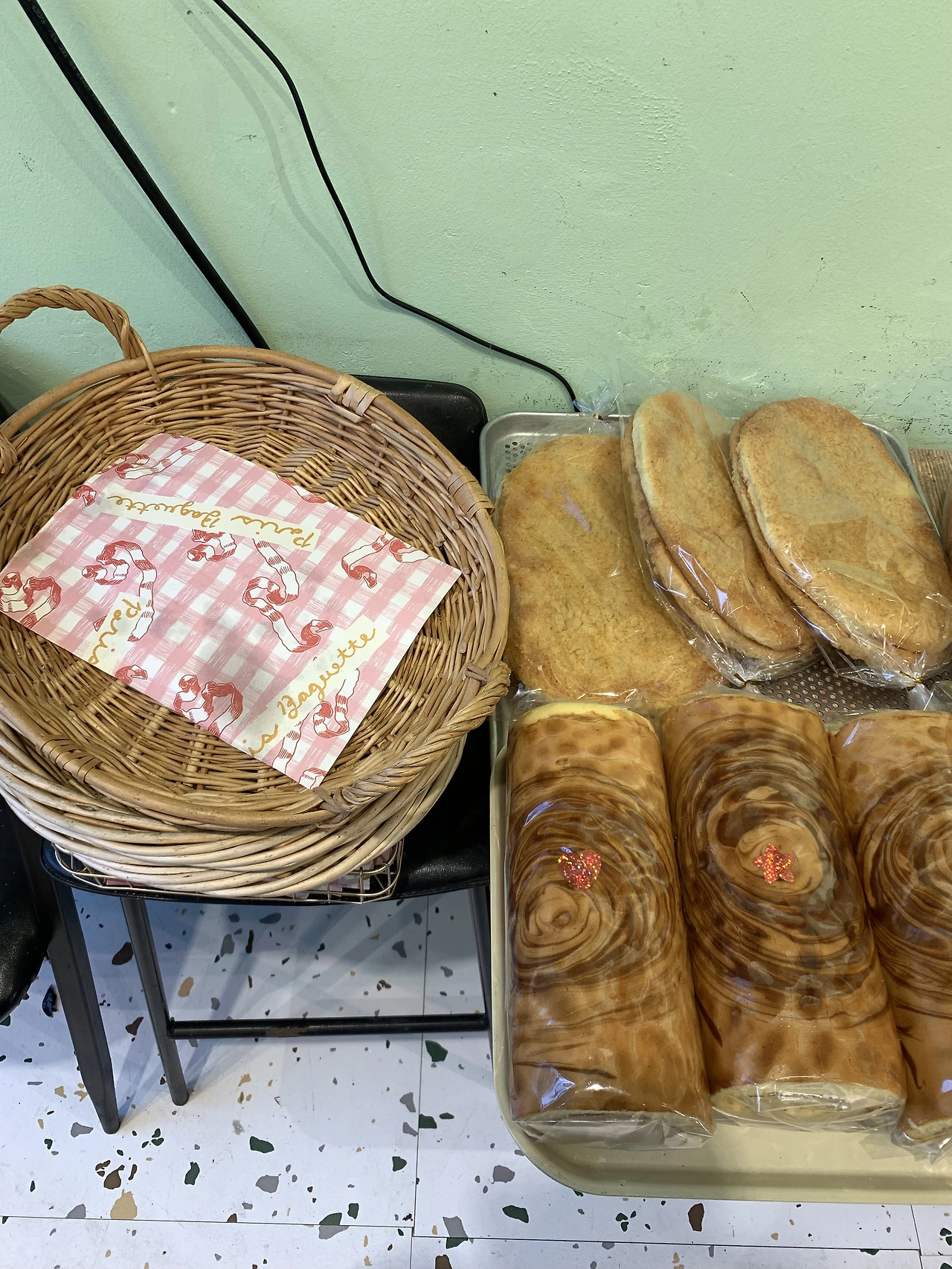 흰 바탕의 테라초 바닥과 연두색 벽지는 조금 어긋난 느낌이었지만, 이미 가게 안에는 여러 색이 섞여 있었고 그 어질러진 색감이 묘하게 신선하게 어우러졌다. 작업 중이던 분은 사장님의 따님 같았다. 아이가 있구나—또 혼자 상상하며, 아기자기한 소품들 사이 두리뭉실 놓인 빵들로 시선을 옮겼다.