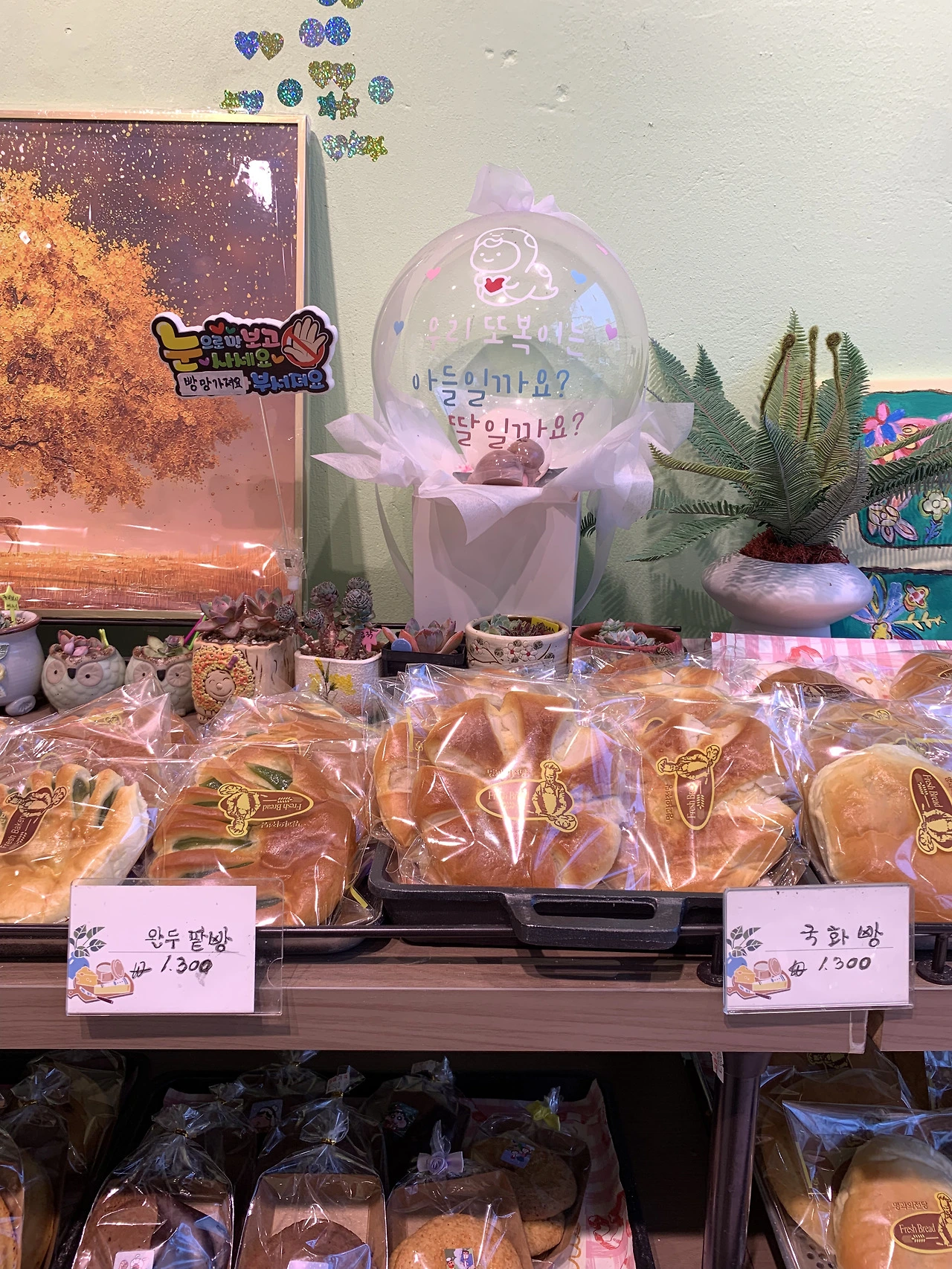 - 빵 봉투마다 붙은 캐릭터 스티커, 선반 위 인형과 화분들이 정겨운 분위기를 만듦