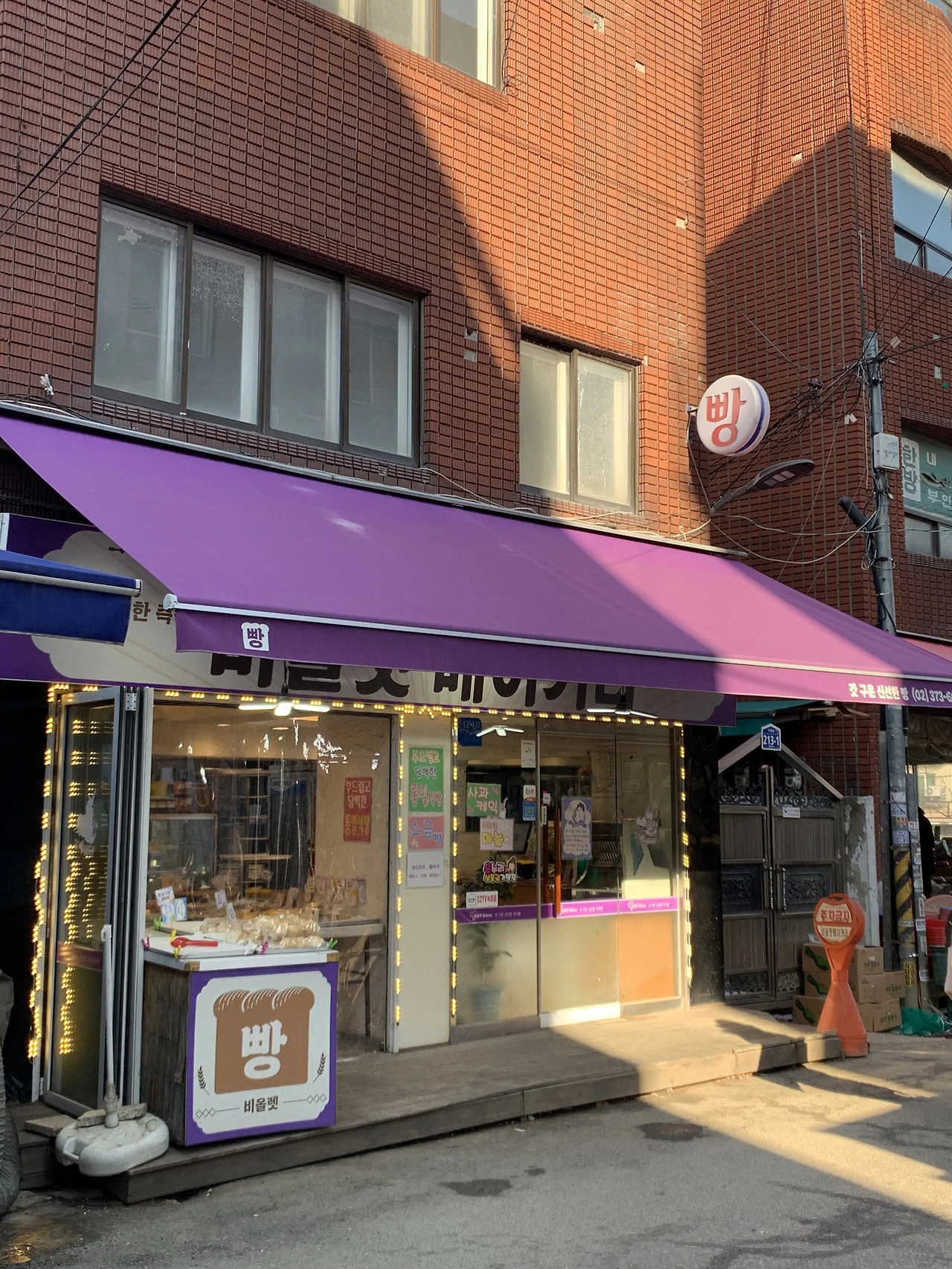마음을 추스르고 다음 목적지로 향했다. 오늘 소개할 <비올렛베이커리>. 대림시장 근처에 자리한 이 빵집은 이름처럼 눈부신 보라색 어닝이 가장 먼저 눈에 들어온다. 멀리서도 단번에 찾을 수 있을 만큼 또렷한 색이다. 빵집 옆에는 참기름 가게가 있고, 한 집 건너 과일 가게도 보인다. 시장 초입답게 주변은 어수선하고 활달한 분위기인데, 그 한가운데서 반짝이는 빵집의 모습이 묘하게 이 동네의 터줏대감처럼 느껴졌다. 참, 밝은 보라색은 건강과 치유의 색이기도 하다. 요양 중인 사람이 보라색을 보면 즐겁게 느낀다고 하니, 이 빵집의 색감이 괜히 더 따뜻하게 다가온다. 가게 안으로 들어가기 전부터 마주하게 되는 수많은 POP들. 현란한 색의 안내문과 글귀들이 과감한 시장 풍경과 닮아 있다. 마치 “여기를 봐, 우리가 여기 있어!” 하고 외치는 듯한 표정이다.